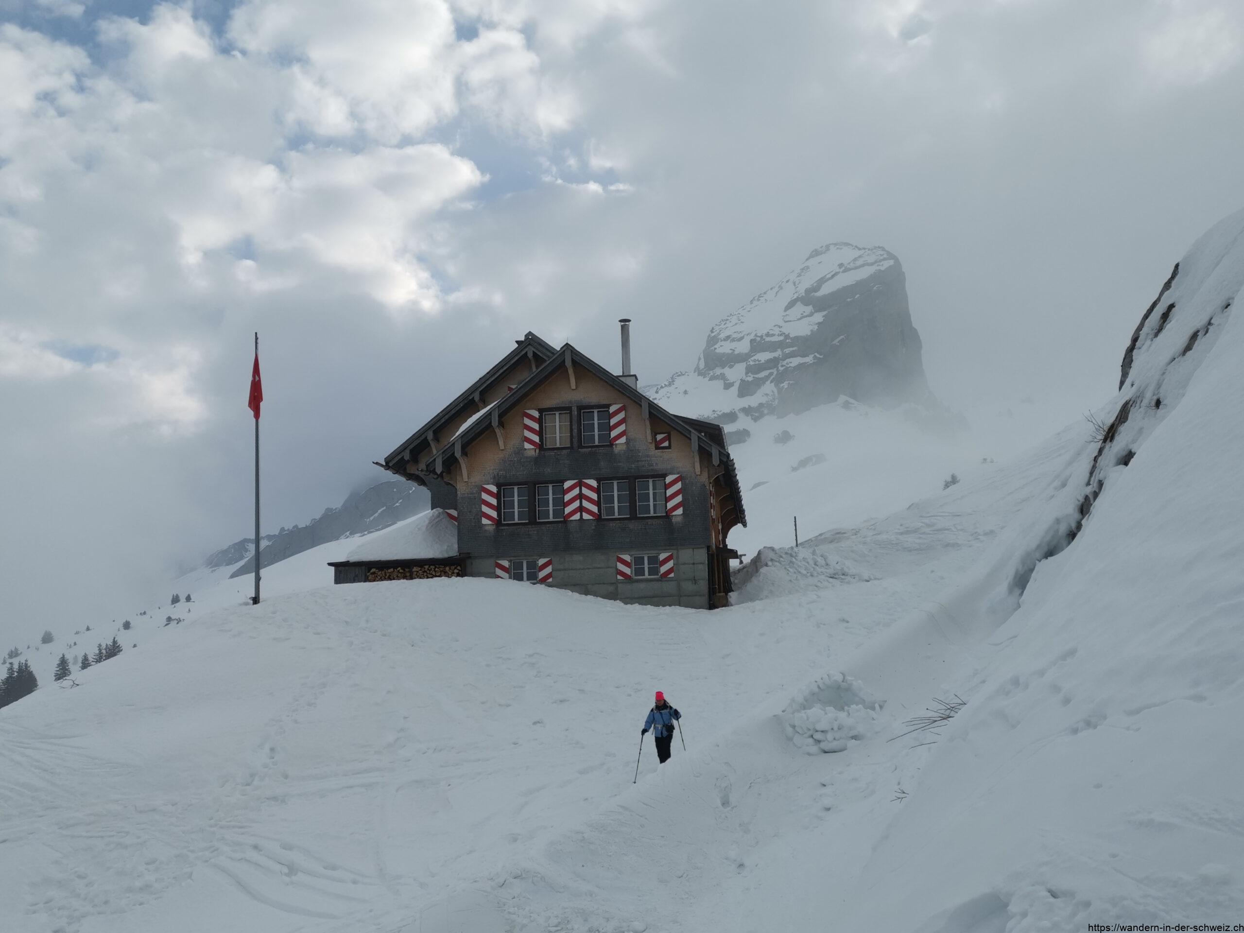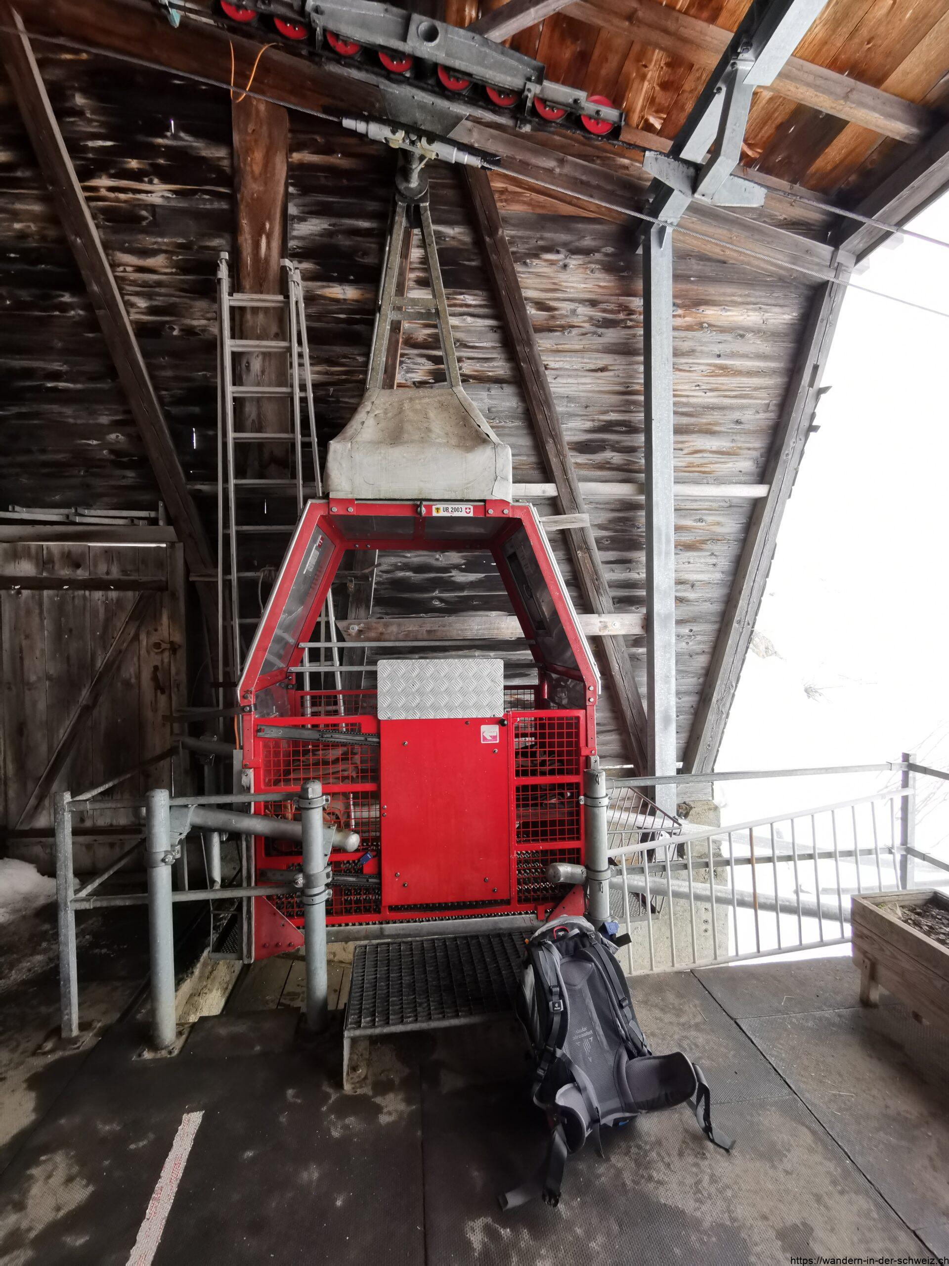 Um endgültig zurück in die Heimat zu gelangen läuft man auf dem selben Weg zurück Richtung Spilauersee. Diesmal bin ich jedoch ein Stück oberhalb des Sees an der Alp Spilau entlanglaufen. Der Schnee ist hier fester und man kommt leichter vorwärts. Dazu kann man hier auch nochmal eine kleine Rast einlegen, es gibt eine Feuerstelle die zum Verweilen einlädt. Wer eine Übernachtung in der Lidernenhütte gebucht hat, kann von hier aus dorthin gelangen oder Richtung Spilau zur Bergstation der Seilbahn absteigen. Beide Möglichkeiten verlaufen erst einmal gemeinsam nach Nordwesten, bevor es rechts zur SAC-Hütte und links nach Spilau geht. Zu diesem Zeitpunkt war es bereits so neblig, dass keine 20 Meter Sicht mehr vorherrschte; die Spuren weisen aber verlässlich den Weg und es ist leichtes Gehgelände. In Spilau wartete zum Abschluss noch eine beindruckende Überraschung: die Hütten waren bis über das Dach eingeschneit. Ein Paar hatte gerade ihre Hütte freigeschaufelt und aus dem Kamin rauchte es, sodass die Szenerie eine ganz eigene Stimmung hatte. Für diejenigen, die im Flachland aufgewachsen sind, ist das sehr beeindruckend zu sehen. Circa 15 Minuten später war ich an der Bergstation angekommen. Die letzte Bahn hinunter fährt um 16.30 Uhr, wer später hinab möchte, sollte unbedingt vorher anrufen und sich ankündigen. Die Betreiber sind sehr freundlich, freuen sich aber auch auf ihren Feierabend. Mittels dem Telefon vor Ort kann man dann seine Abfahrbereitschaft kundtun und unter das Nebelmeer hinabschweben.