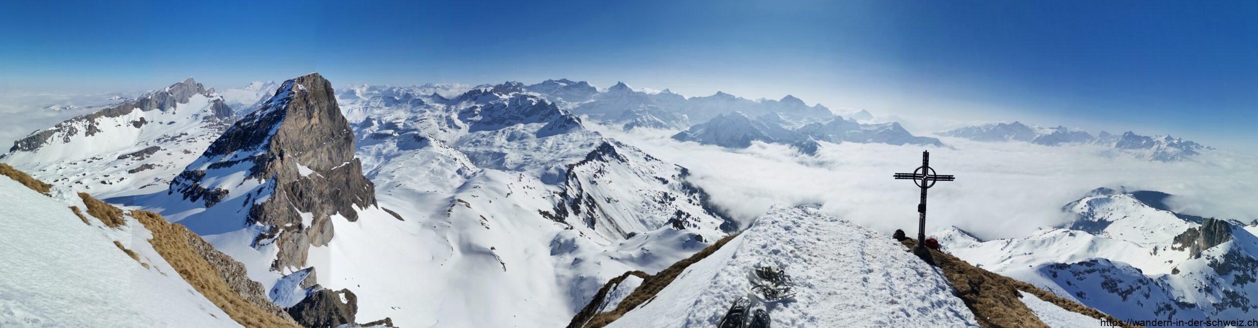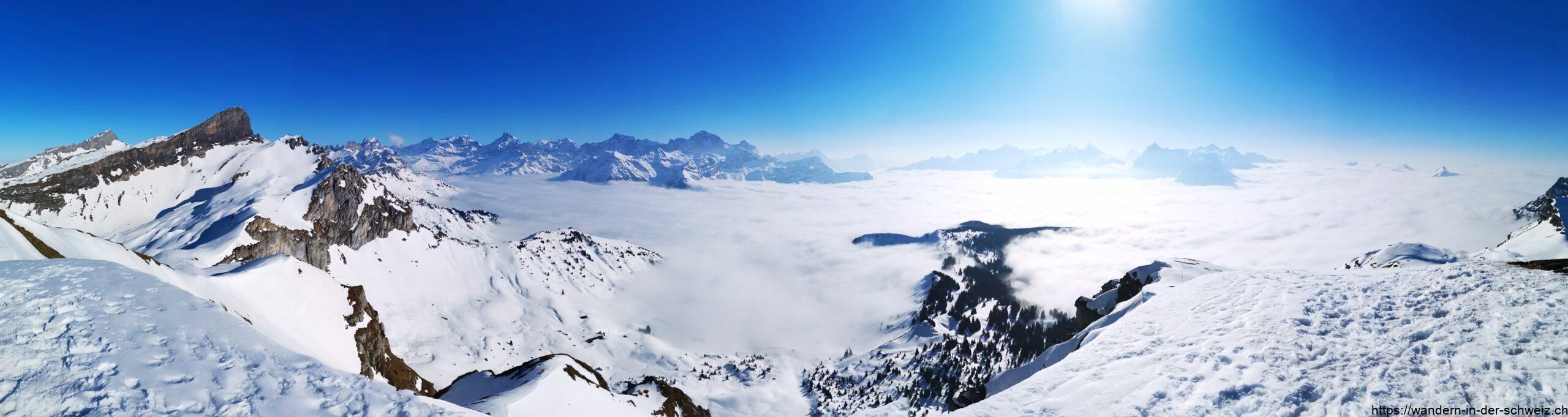 Auf dieser Runde können die ersten Höhenmeter ganz bequem mit der Seilbahn für CHF 16 (hin und retour) zurückgelegt werden. Mit dem öffentlichen Verkehr anzureisen ist nicht ganz einfach, es fährt lediglich zweimal pro Tag ein Bus. Für Autofahrer stehen vor der Seilbahn aber einige kostenfreie Parkplätze zur Verfügung. Die Luftseilbahn Chäppeliberg-Spilau im Riemenstaldner Tal bietet zwei Besonderheiten: Ihre Talstation liegt im Kanton Schwyz, die Bergstation dagegen im Kanton Uri. Des Weiteren ist die 4-Personengondel ein offener vergitterter Käfig, sodass alle Coronavorgaben zur Durchlüftung problemlos erfüllt werden. Wer Glück hat, kann während der Fahrt sogar Auerhühner beobachten! Von der Bergstation (1’717 m) kann man bereits die nur wenige Gehminuten entfernt östlich gelegene SAC Lidernenhütte (1’727 m) entdecken und dann auf sie zuhalten. Die Hütte ist geöffnet, Übernachtungen sind also möglich und es wird ein kleines Take-away Sortiment angeboten. Von hier aus geht es Richtung Südosten ungefähr entlang des Sommerwanderweges auf den Rossstock (2’461 m). Der Rossstock ist der höchste Gipfel dieser Tour und ist der meistbestiegene Gipfel der Chaiserstockkette. Der Winterweg ist nicht markiert und man kann nach eigenem Gutdünken aufsteigen oder orientiert sich an der Vielzahl der Spuren von Schneeschuh- und Tourenskigängern. Letzteres macht den Aufstieg bedeutend einfacher, da der Schnee dort festgetreten ist. Man steigt teils geradeaus und teils in geschwungenen Bahnen auf, das freie Gelände ist in der Regel nicht allzu steil. Auf der rechten Seite liegt der zugefrorene Spilauersee mit der Alp Spilau, auf der man im Sommer ebenfalls übernachten kann. Die letzten Höhenmeter zum Gipfel dem Rücken folgend steht man schliesslich auf einem Grat. Oben angekommen erwartete mich ein grandioser Rundumblick – bei guten Bedingungen sind der Vierwaldtstättersee und das gesamte Mittelland bis zum Schwarzwald zu überblicken. Deutlich näher und gut zu erkennen dagegen Chaiserstock (2’515 m) und Fulen (2’491 m).