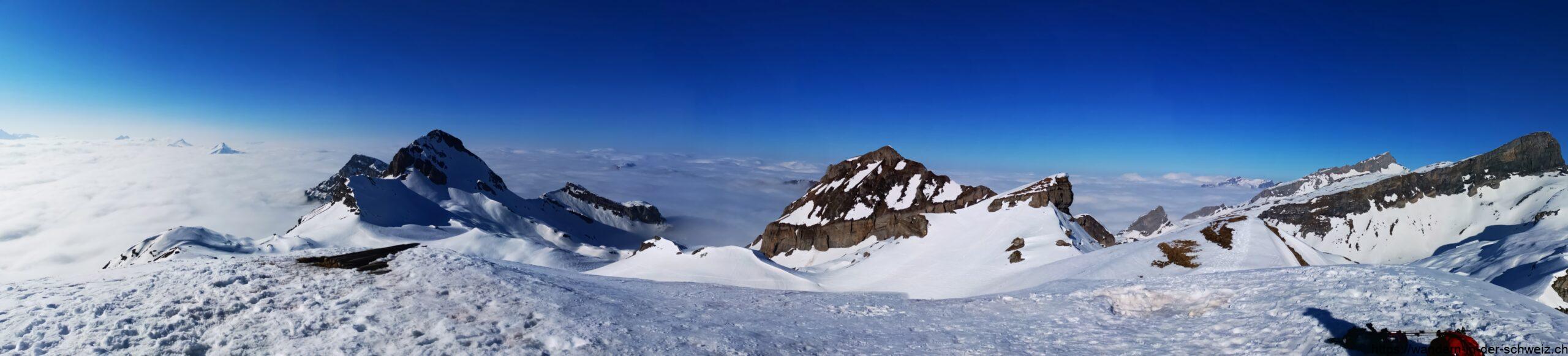 Für den Abstieg sind wir erst einmal den gleichen Weg gefolgt wie hinauf. Manch einer mag es verlockend finden vom Rossstock nach Westen zum Spilauerstock (2’269 m) und sich von dort wieder entlang des Sommerweges zum Hagelstock zu orientieren. Allerdings konnte ich unterwegs immer wieder Reste von Lawinenabgänge sehen und fand es in diesem hügeligen Gelände tatsächlich schwieriger zu beurteilen, wo fester Untergrund ist und wo man auf der Kuppe einer Schneewehe eigentlich über dem Boden steht. Dementsprechend kam es auch dazu, dass ich abseits der Spuren unterwegs war, in sehr steilen Gelände, welches einem WT4 entsprach, und dann einen Hang ungalant und unfreiwillig auf dem Hintern hinunter zum See rutschte. Idealerweise geht man also so weit zurück bis man relativ flach Richtung Südwesten zum Spilauersee absteigen kann und erspart sich somit den Abenteueranteil der Tour. Der Hagelstock (2’181 m) ist ebenfalls ein beliebtes Ziel vom Lidernengebiet in die Eggbergen, sodass die Routenfindung immer nach Südwesten kein Problem darstellt. Der Schnee wird jedoch im Laufe des Tages bei Sonne sehr pappig, nass und schwer, was den Aufstieg vom See anstrengend macht. Einsinken vorprogrammiert und nicht zu vergessen, dass ich bereits 700 Höhenmeter hinter mir hatte. In der Senke zwischen dem fassförmigen Siwfass (2’180 m) und Hagelstock hält man sich links und erreicht nach wenigen Minuten den zweiten Gipfel dieser Tour. Auch er bietet eine tolle Aussicht auf die Urner Berge. Das Nebelmeer hatte sich weiter nach oben gearbeitet und der Blick auf den Urner See blieb mir dadurch zwar verborgen; aber alleine dort oben zu sein und das Nebelmeer mehr beobachten wie es durch sein Aufsteigen die Szenarie verändert war es vielleicht sogar noch schöner.
