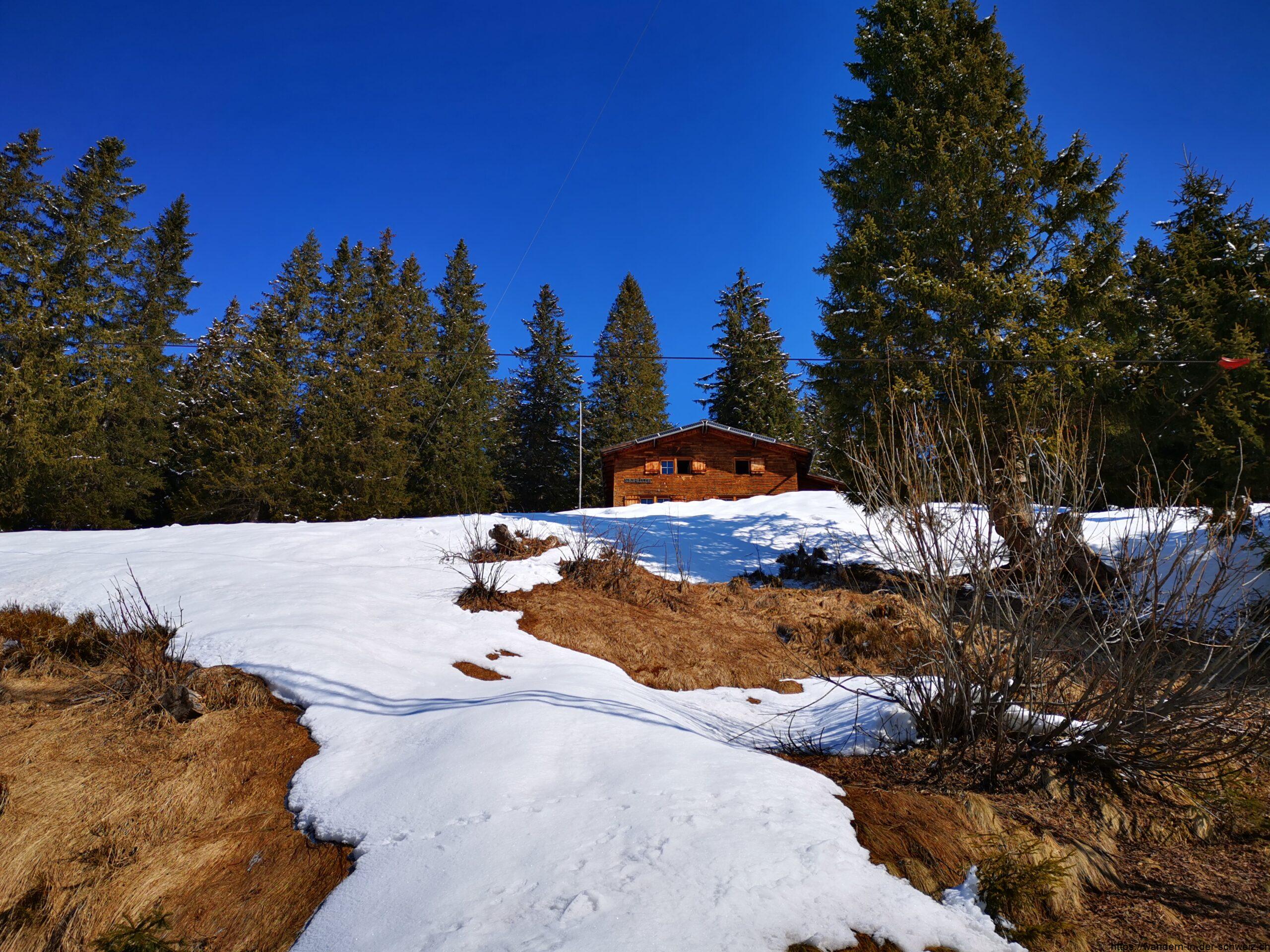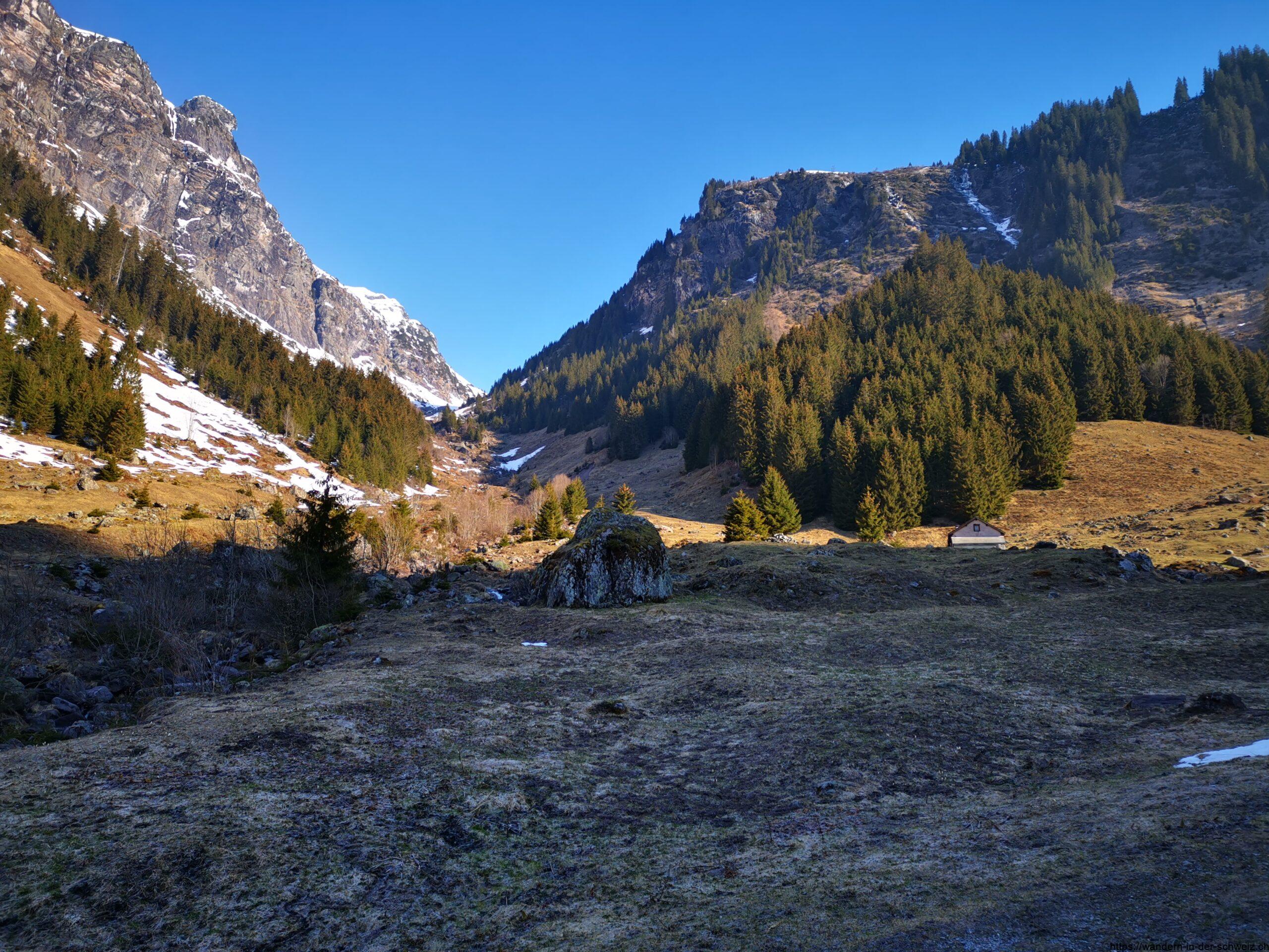 Bis zur Skihütte Mülibachtal folgt die Route der ausgeschilderten breiten Schotterstrasse durch lichte Waldstücke und zwischen Grünflächen hindurch. Das Gelände ist alles andere als anspruchsvoll weshalb man sehr gut und zügig vorwärtskommt. Wer Glück hat, kann in dem Wald etliche Rehe entdecken. Ich durfte zwei Gruppen dieser scheuen Waldbewohner beobachten. Während des Aufstiegs ist das Tagesziel, der Heustock (2’471 m), lange nicht zu sehen. Dafür wird man zu Beginn vom Güntelchamm begleitet, einem letzten Ausläufer im Grat Schwarzstöckli, dessen höchster Punkt der Gufelstock ist. Bereits nach einer Stunde erreicht man das Üblital, einer Alpweide, auf 1’190 m, das auf mich einen wundervollen, einladenden erhabenen Eindruck gemacht hat. Weiter geht es nach Gams auf 1’515 m. Diesen Ort kann man sich für den Rückweg schonmal merken. Nur 45 Minuten später ist die Skihütte Mülibachtal (1’779 m) erreicht und die ersten 900 Höhenmeter absolviert. Zeit für eine kleine Pause! Wer sich vorangemeldet hat, kann hier übernachten und wird auch ganzjährig bewirtet.