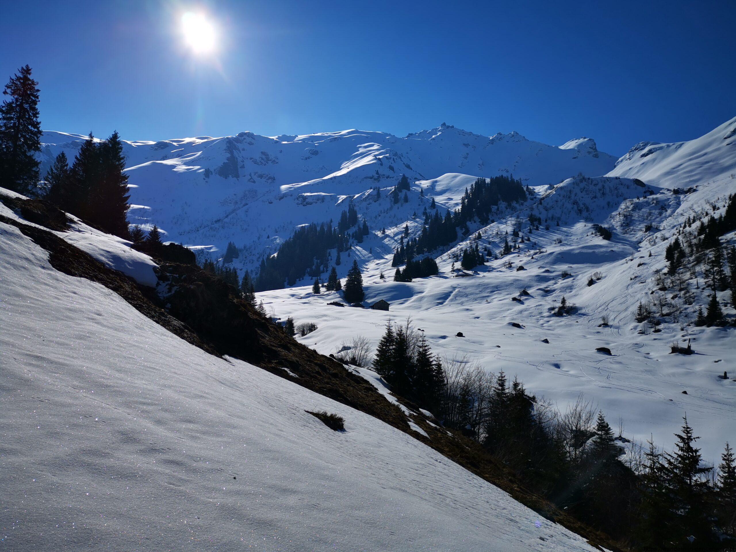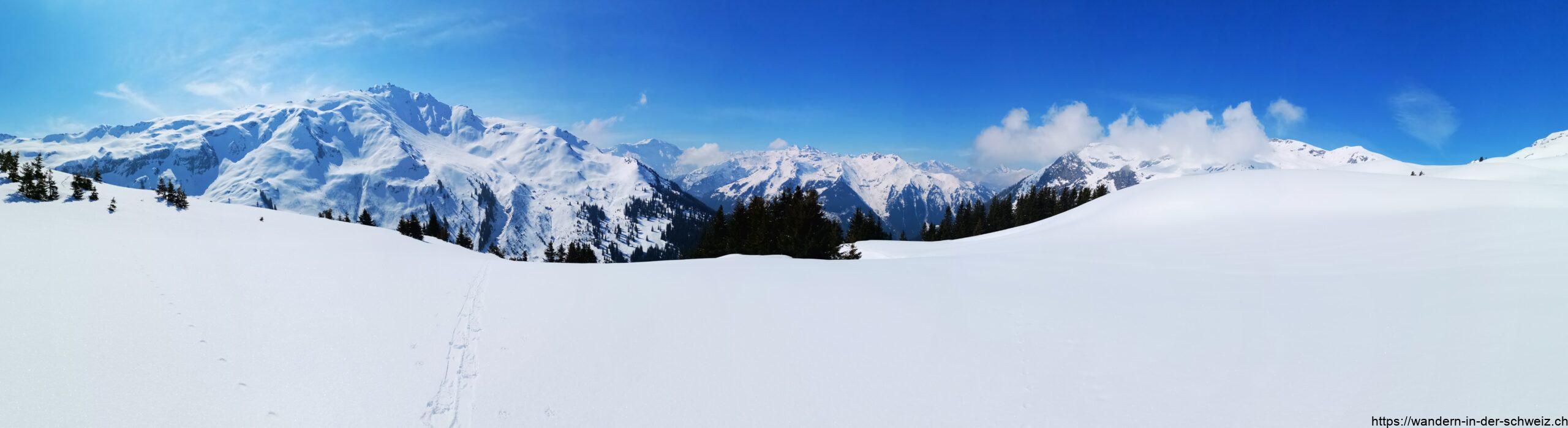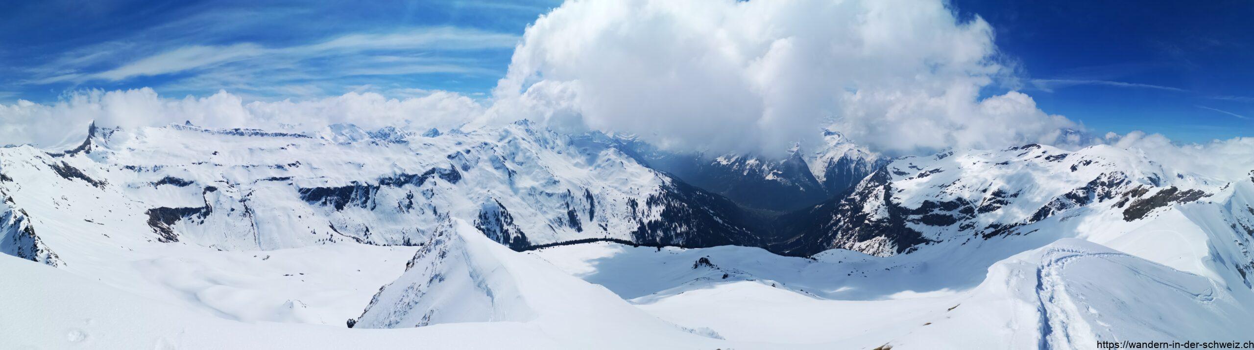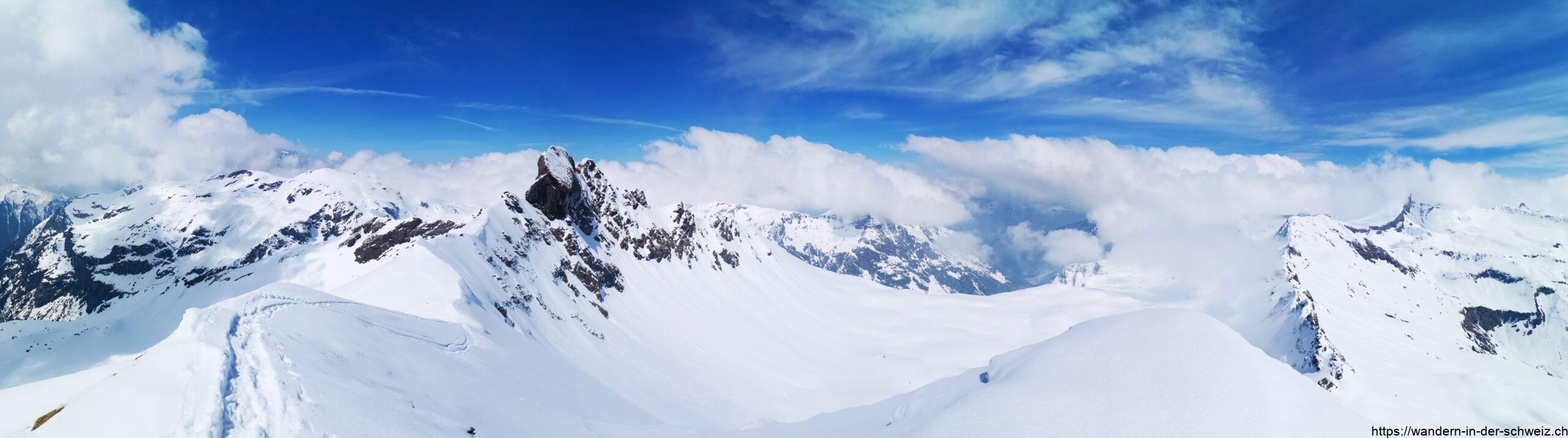 Am Wegweiser wenige Meter der Strasse weiter folgend geht es nun in die einzige Richtung weiter, wo kein Hinweisschild hinzeigt: weiter geradeaus der Nase nach Richtung Norden. Dem Gelände nach zu urteilen scheint hier im Sommer tatsächlich ein Weg zur Alp herzuführen, der aber nicht markiert ist. Hier ist jedenfalls unser nächstes Zwischenziel. Der Heustock ist nur sehr selten begangen und dementsprechend einsam ist die Route. Ich liebe das, aber der Nachteil ist, man muss sich auf sich selbst verlassen. Auf der ganzen Strecke gibt es nur selten Handyempfang; Hilfe holen ist also schwierig. Und wer nicht wie ich das unvorstellbare Glück hat dass ein einsamer Tourenskifahrer einen Tag vorher eine Spur gelegt hat muss selbst den Weg hinauffinden. Auf der Höhe der Glattmatt, auf der auch die Alp liegt sieht man nun das erste Mal den Heustock. Der Rücken über den man aufsteigt erscheint nicht sonderlich schwierig und der Gipfel bereits zum Greifen nah. Ich konnte kaum glauben dass es immer noch mehr als 500 Höhenmeter zu absolvieren waren. In langen Kehren ging es nun recht zäh in der Südflanke zum Gipfel – aber jeder Meter davon hat mehr Aussicht auf die umliegenden Berge freigegeben. Ich habe es genossen! Und als ich schliesslich am Grat das Panorama des vor mir sah, war ich rundum begeistert.