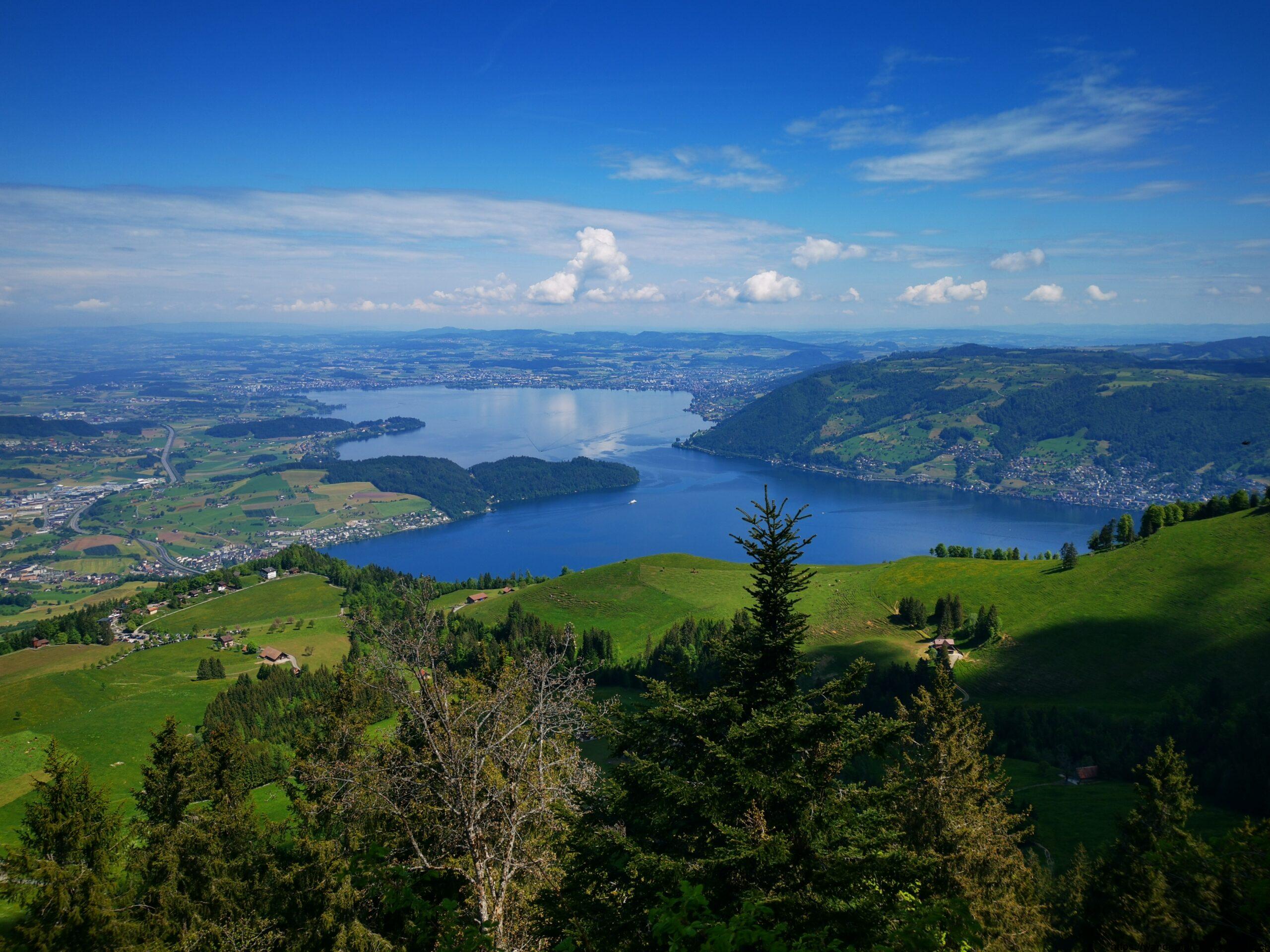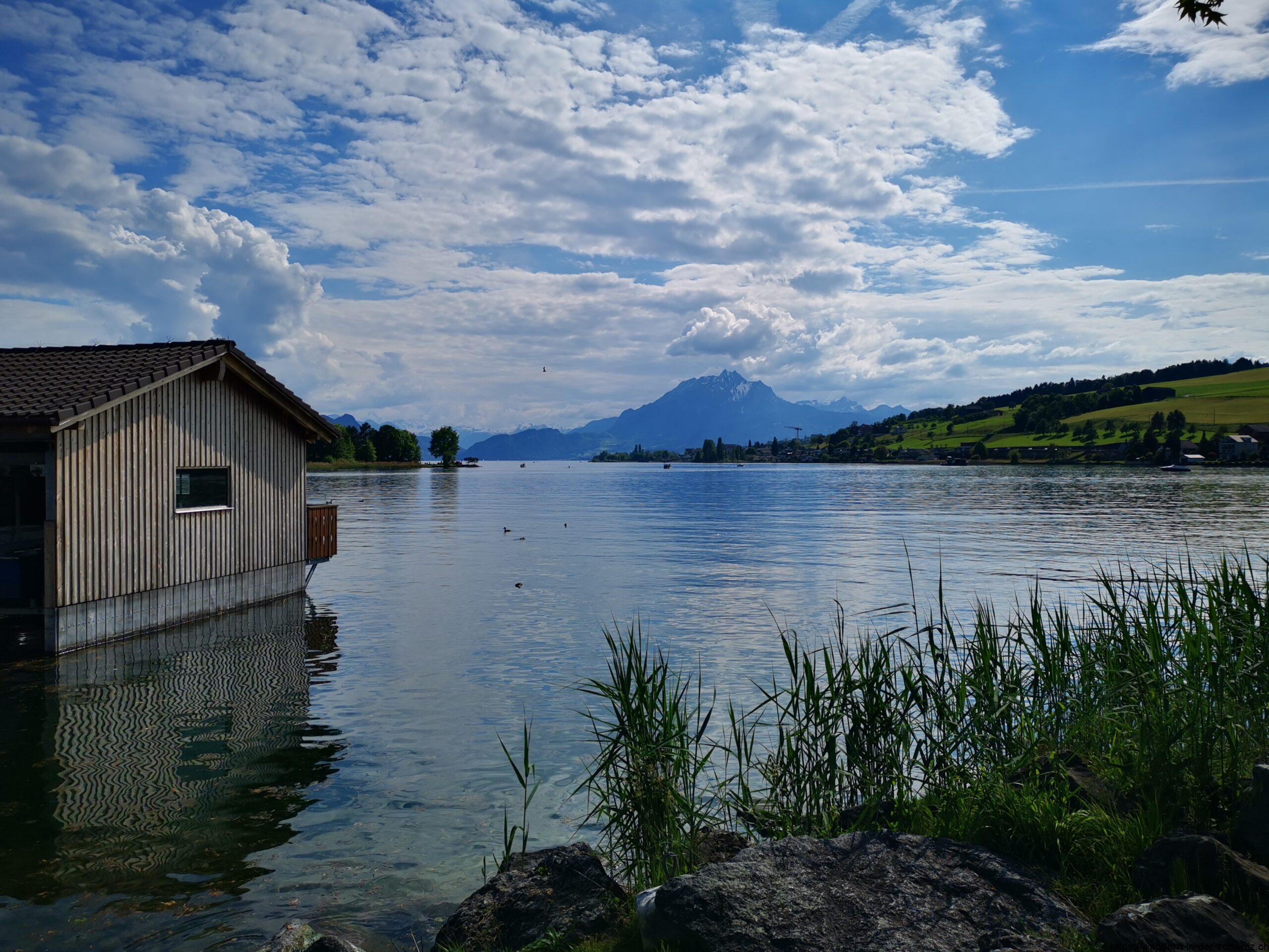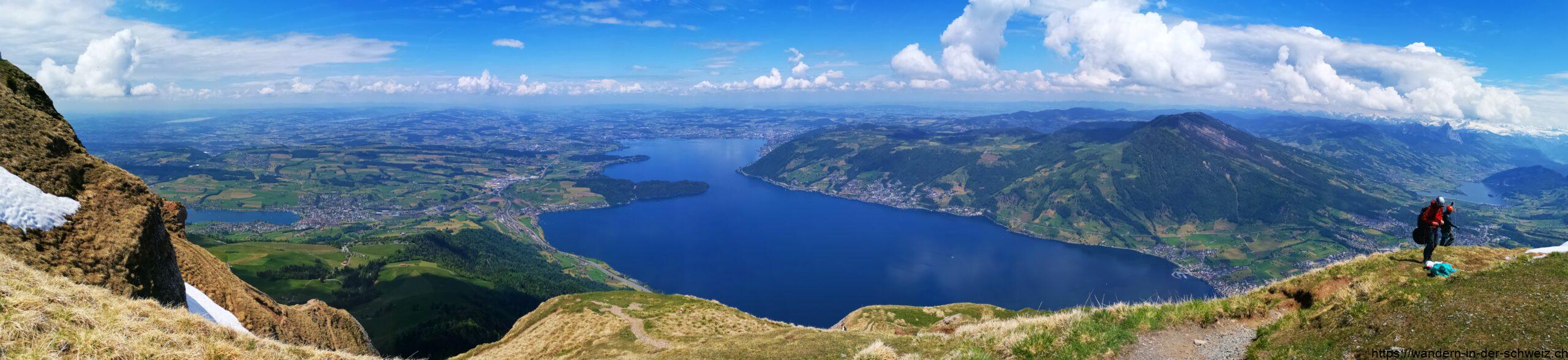 Zurück geht’s prinzipiell den gleichen Weg wie man hochgekommen ist. Wer etwas mehr Zeit hat, kann hier aber eine schöne Rundtour über die Grillhütte und Rigi Rotstock zurück nach Küssnacht machen. Insbesondere für Leute, die am Strandbad Seeburg das Auto abgestellt haben und schneller unterwegs sind als die Angaben am Wegweiser, könnte sich dies lohnen. Und wer springt zur Belohnung nicht gern ins kühle Nass 😉 ? Wer möchte kann auch nach Arth oder Goldau absteigen und dann mit den öffentlichen Verkehrsmitteln zurückfinden – Möglichkeiten wieder hinabzukommen gibt es folglich genug. Alle anderen geniessen einfach ohne Eile die Aussicht. Ich persönlich habe kurz vor Küssnacht die Rückroute etwas abgekürzt und bin ohne Umweg über die Gesslerburg zurück ins Zentrum. Eine Genusspause mit Blick zum Pilatus (2’128 m) musste stattdessen sein.