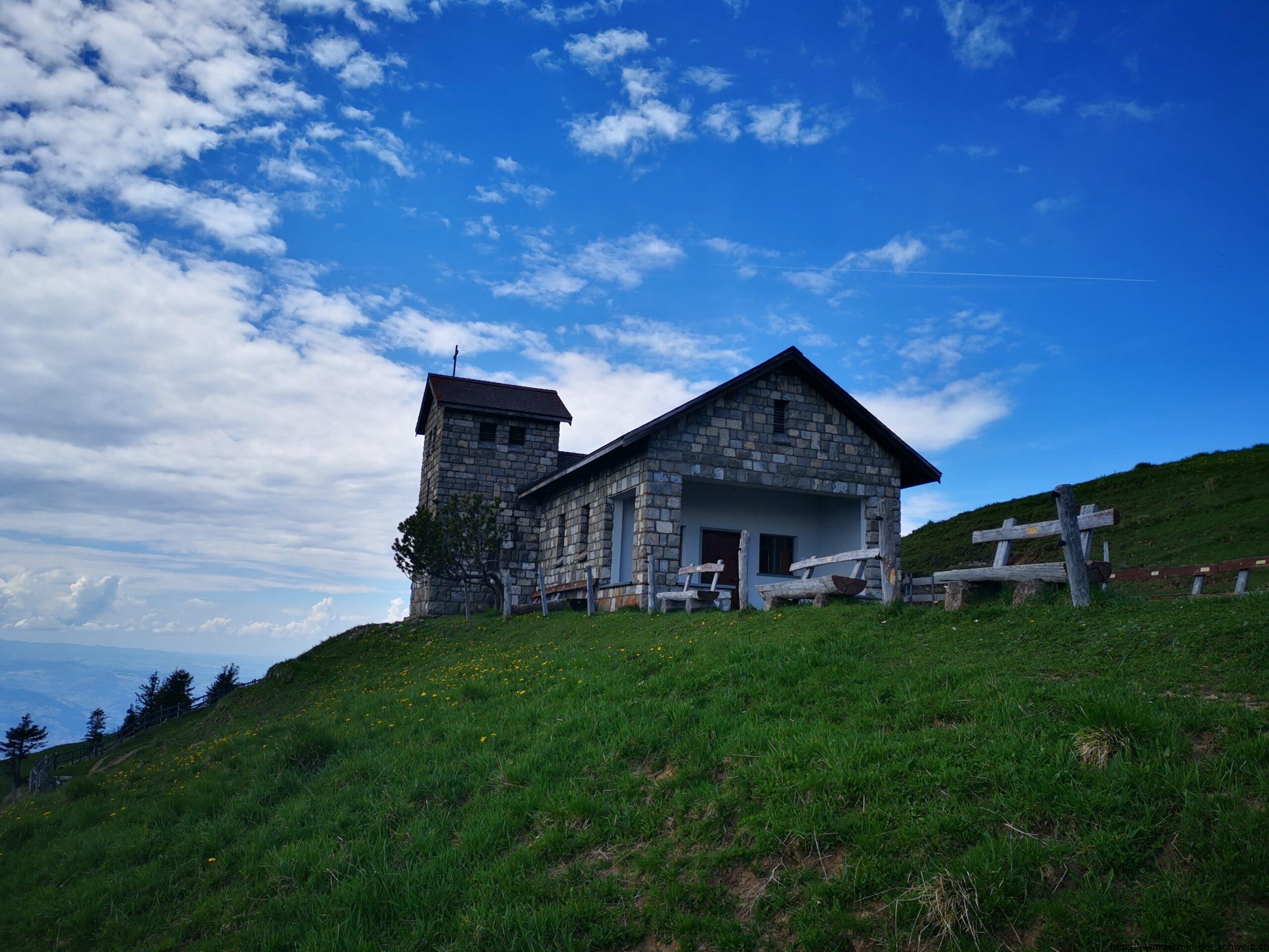 Weiter geht’s auf dem noch gelben Wanderweg zum Restaurant Alpenhof (557 m), der sich auf dem Rückweg für eine Rast mit Speise und Trank anbietet, und dem anschliessenden Seilpark Rigi, wo man in den Baumkronen einen Kletterparcour absolvieren kann. Für Kinder ein tolle Möglichkeit sich auszutoben und der Blick zurück zum See hat auch was. Zur Seebodenalp (1’020 m) sind es nun noch knapp 1.5 h und ab dort ist dann auch einiges los. Denn die meisten Wanderer verzichten es von Küssnacht aufzusteigen oder die Luftseilbahn Küssnacht – Seebodenalp zu nutzen, die sie für CHF 15 in 8 Minuten hinaufbringt, sondern parkieren für CHF 9.50 direkt hier oben. Damit erspart man sich fast 600 Höhenmeter und der Gipfel ist nur noch 2.5 h weit weg; eine überschaubare Distanz für einen Sonntagsspaziergang. Im Pulk wandert man folglich über Holderen (1’116 m), Rütlersplangg und Gruebi Düssen mit ihren Feuerstellen hinauf zu Rigi-Staffel, wo auch die Zahnradbahn Station macht. Glück dem, der daran gedacht hat ein Grillwürstchen einzupacken. Für Vergessliche hilft das Büdchen kurz oberhalb von Rigi-Staffel aus – fertig zubereitet natürlich. Insgesamt ist der Weg top markiert, einfach zu gehen und kann auch mit Kindern zurückgelegt werden. Spätestens ab Rigi-Staffel eröffnet sich einem zudem das umliegende Bergpanorama – und damit die Vorfreude auf den Gipfel. Entlang dem Kulmweg und vielen Aussichtpunkten, vorbei an der Bergkapelle Regina Montium, stand ich dann zum zweiten Mal in meinem Leben auf dem Gipfel der Königin der Berge. Heute lag allerdings deutlich weniger Schnee 😀