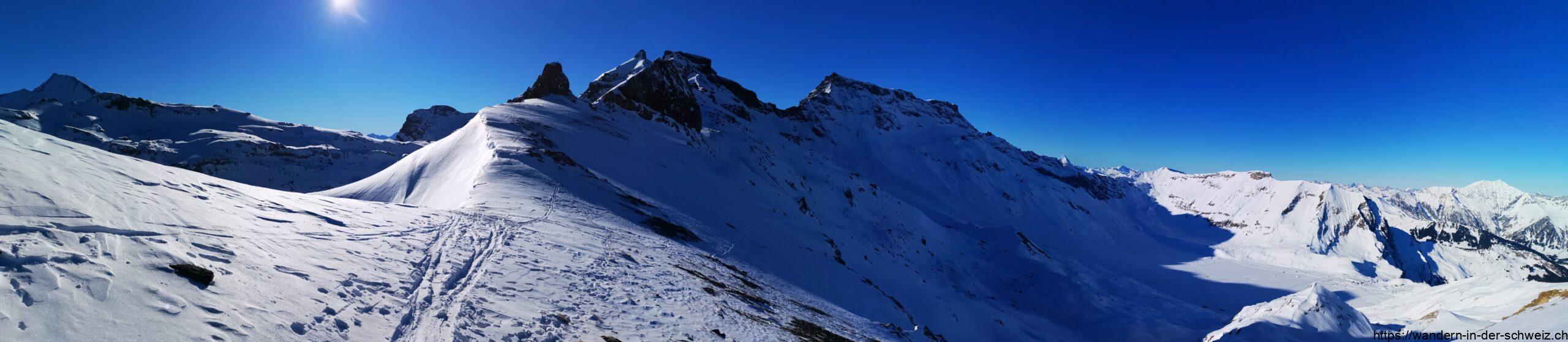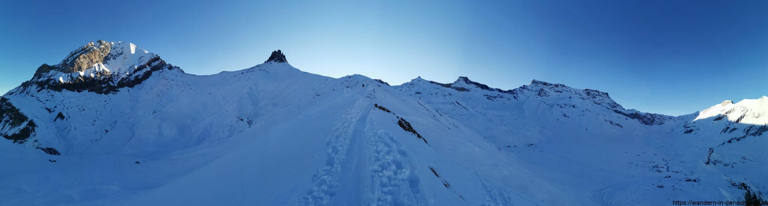 Weiter auf dem Grat biegt der Weg schliesslich nach Süden und nach weiteren 60 Minuten erreicht man schliesslich das Wegkreuz Englistengrat (2’615 m). Nach Westen geht es hinab zum Tällisee oder weiter über den Schwartzgratli zum Wyssi Flue (2’472 m). Nach Süden folge ich dem Grat weiter zum Chindbettipass (2’636 m), der nach 20min erreicht sein soll. Mich haben unterwegs allerdings einige Gämse aufgehalten, die auf der Chindbettihore (2’692 m) standen. Total begeistert von dieser Entdeckung musste ich erstmal Fotos machen. Irgendwann musste ich dann leide doch weiter und erreichte den Chindbettipass. Hier wäre von Norden die eigentliche Aufstiegsroute hochgekommen und man sieht etliche Gruppen, die auch diese Variante wählen. Angeblich waren bei dieser Aufstiegsvariante sogar Schneehühner zu sehen. Nagut, bei mir gabs Gämse. Es ist auf jeden Fall unbestreitbar schneller so aufzusteigen. Vom Pass aus gibt es jedenfalls keinen ausgeschilderten Wanderweg, der zum Tierhörnli (2’894 m) heraufführt. Dementsprechend geht es nun „weglos“ immer weiter auf der Schulter hinauf bis fast zum Ziel. Ich habe am Fuss gequert und bin hintenherum von Westen kommend an der Südseite aufgestiegen. Das war eine nicht ganz ungefährliche Kletterei und der kluge Mensch zieht dafür vorher seine Schneeschuhe aus. Die Skifahrer waren intelligenter, aber man lernt ja für den Rückweg. Zur Belohnung wartet neben einer bombastisch tollen Aussicht auch ein Gipfel, auf dem ein schönes Gipfelkreuz thront.
