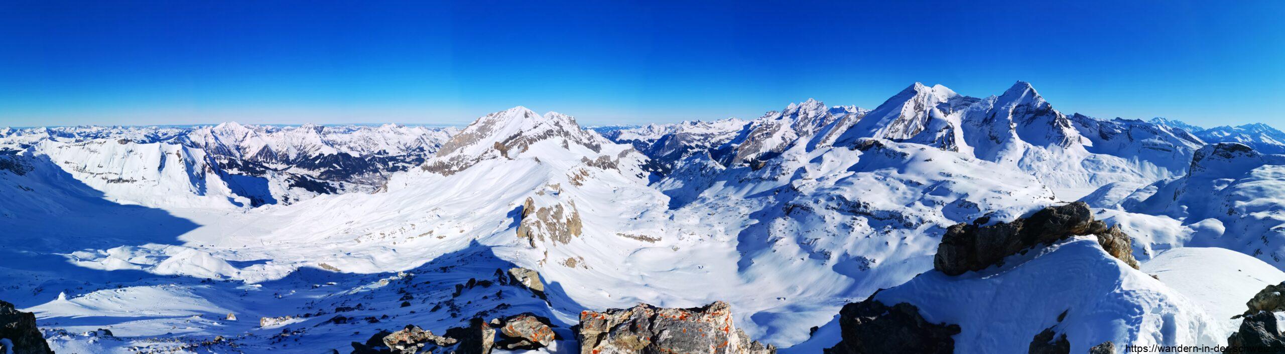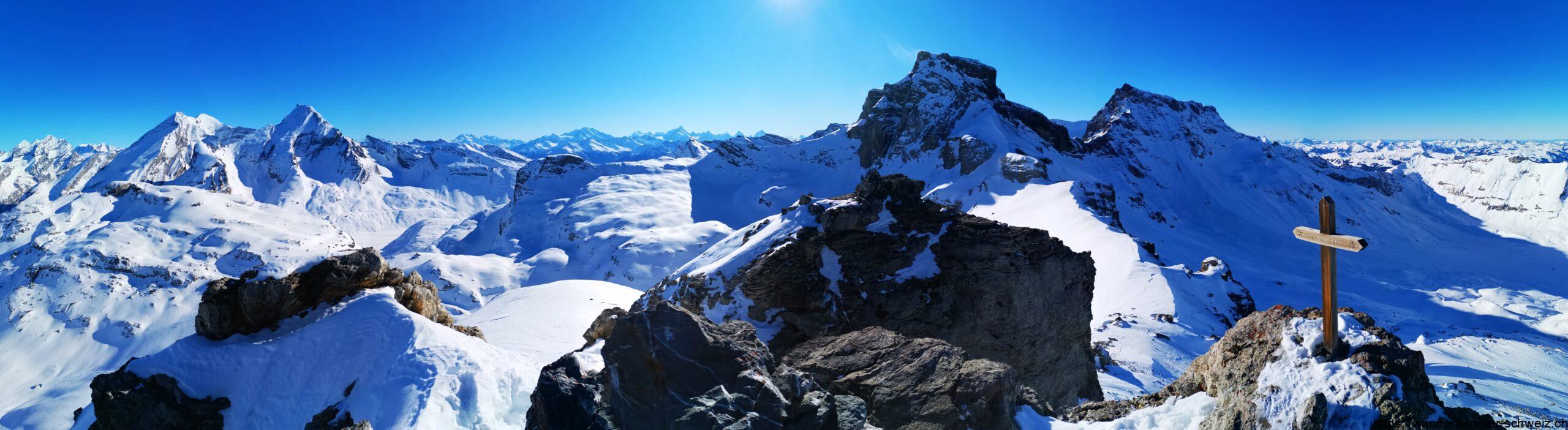 Bei traumhaften Wetterbedingungen zeigen sich (nicht abschliessend): Grossstrubel (3’242 m), Wilhorn (3’248 m), Ammertespitz (2’614 m) Rotstock (2’635 m), Wetterhorn (3’688 m), Eiger (3’967 m), Blümlisalphorn (3’658) Doldenhorn (3’639 m), Breithorn (3’778 m), Aletschhorn (4’193 m), Balmhorn (3’697 m), Rinderhorn (3’449 m), Dom (4’545 m) und sogar der höchste Gipfel der Schweiz, die Dufourspitze (4’634 m)!
