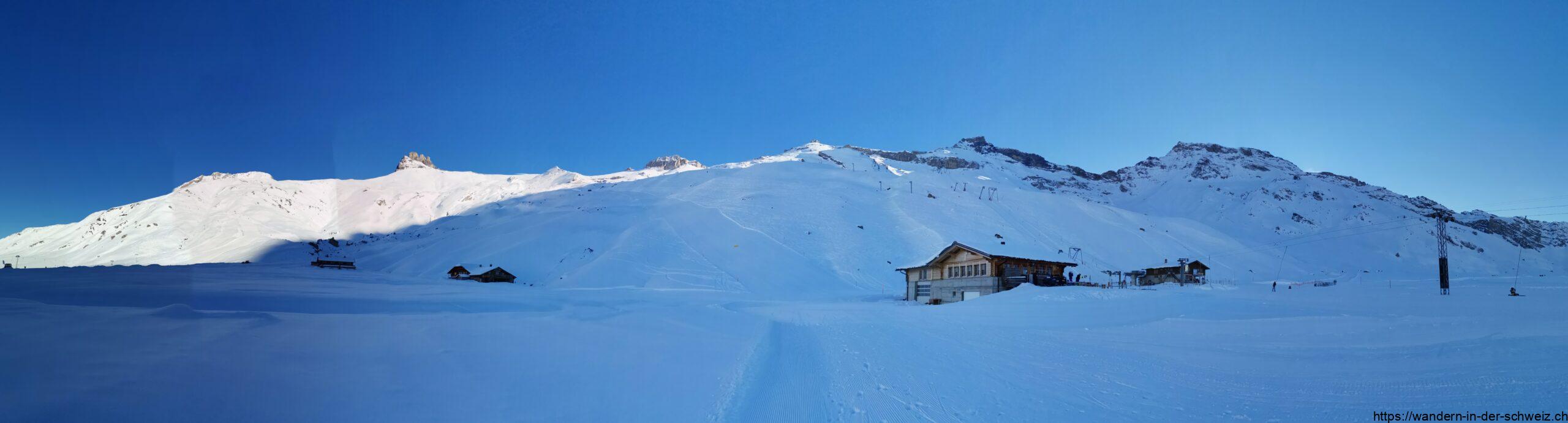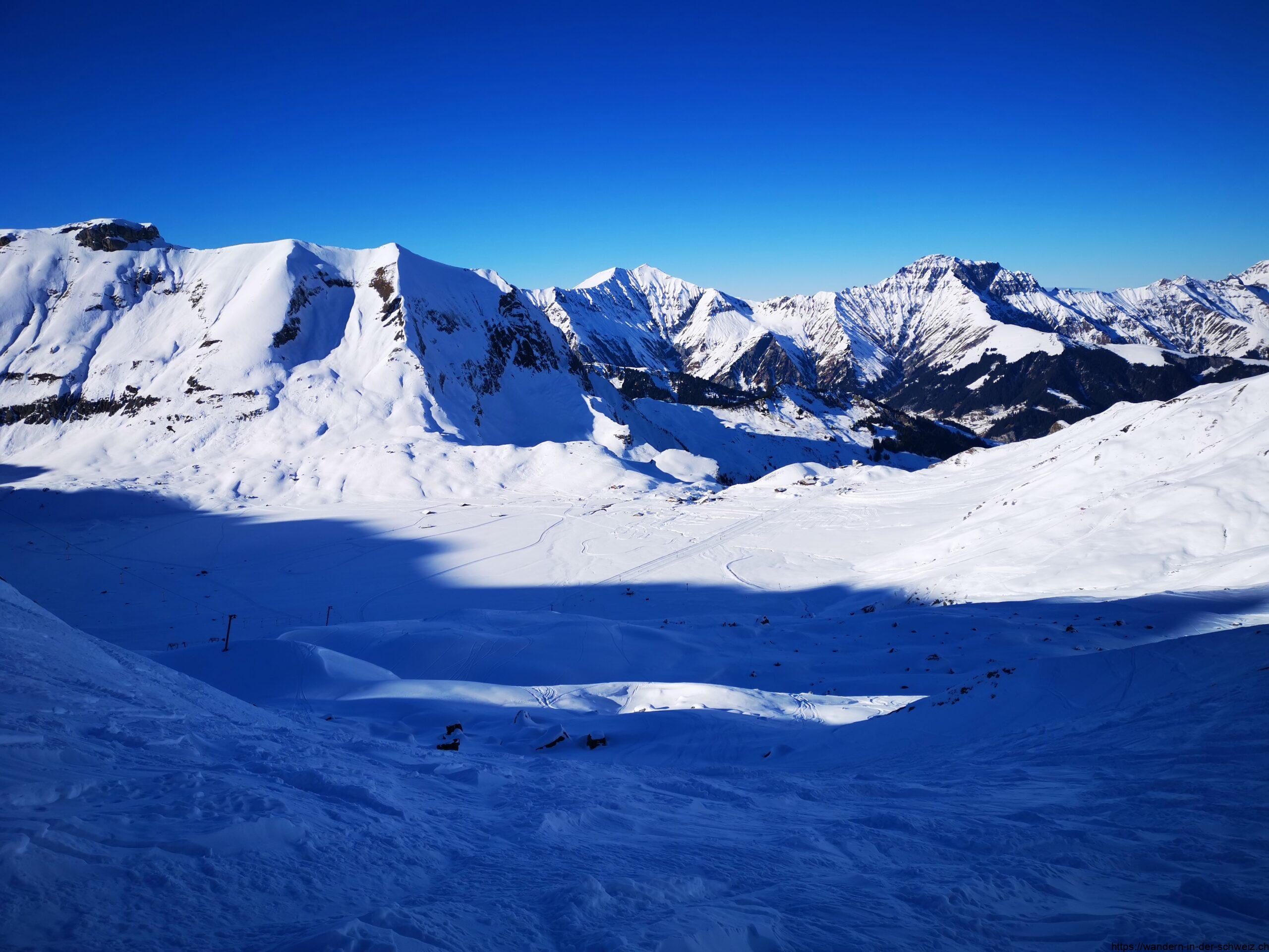 Für den Rückweg muss sich jeder selbst überlegen auf welcher Route er oder sie sich sicher fühlt. Ich wollte die Abenteuerquerung vom Tierhörli zum Chindbettipass eigentlich nicht retour laufen; beim Blick in den Abgrund nach Osten von der Originalroute aus gesehen war ich jedoch der Meinung, dass Rückzug zum Chindbettipass eine grandiose Idee ist. Und so bin ich an der Flanke tatsächlich zurück, jedoch nicht ganz bis zum Pass. Etwa auf halber Höhe beschloss ich quer feldein abzusteigen. Der Schnee lies dies zu, dennoch wäre im Nachhinein der Aufstieg über den Chinbettipass der schnellere Weg gewesen. Denn so landete ich schliesslich mitten auf den Pisten des Skigebiets. Abgesehen davon, dass mir nun völlig die Orientierung fehlte, und es sicherlich nicht vorgesehen (oder erlaubt?) ist über die Piste zu spazieren, hab ich jeden Moment befürchtet überfahren zu werden. Grob gesagt sollte man versuchen dem Lift Dossen E02 oder E03 zu folgen, da dieser zum Restaurant Stäghorä führt. Ganz funktioniert dies nicht, vor Ort ist man gut beraten nordöstlich des Lifts am Rand der Piste 104 Gollet unterwegs zu sein.