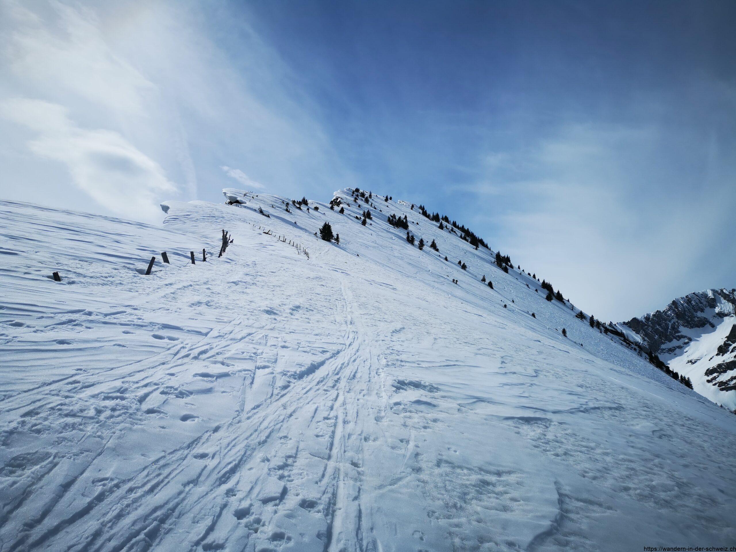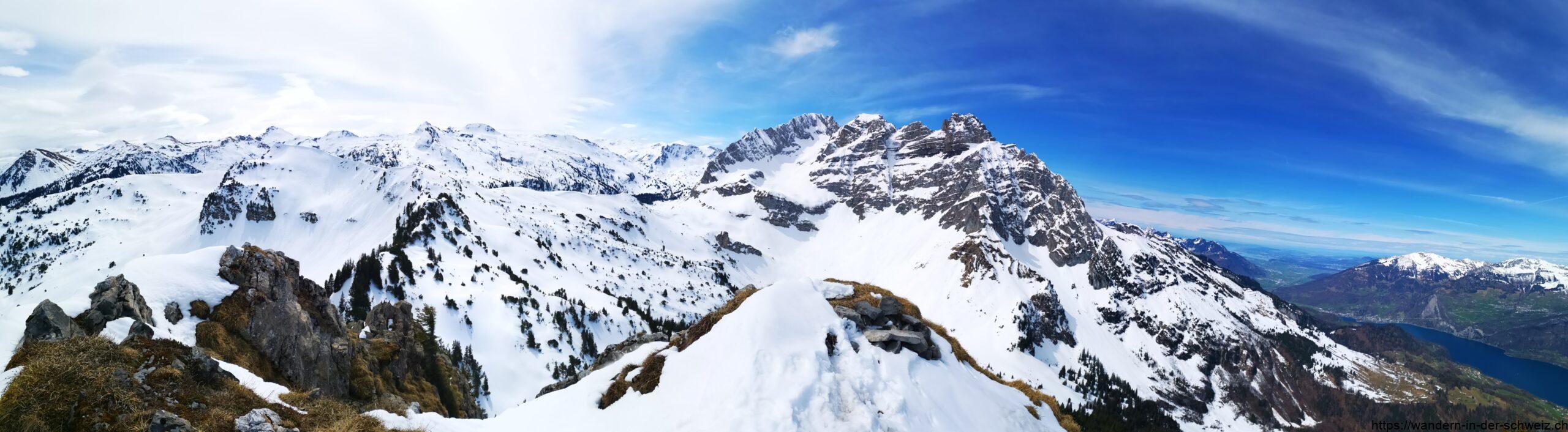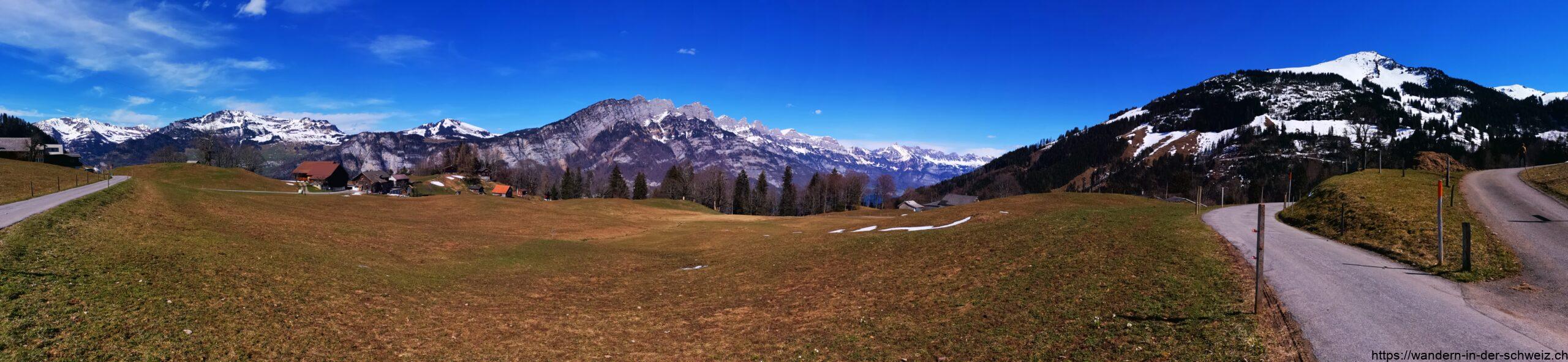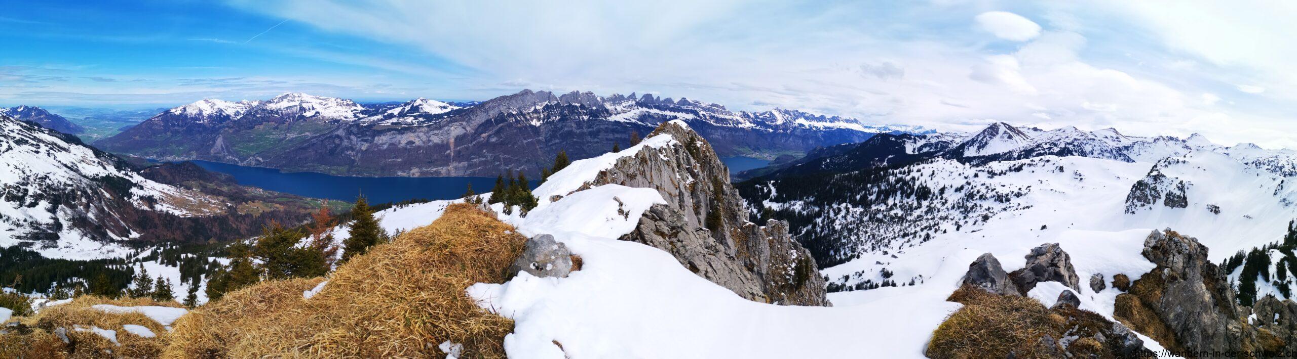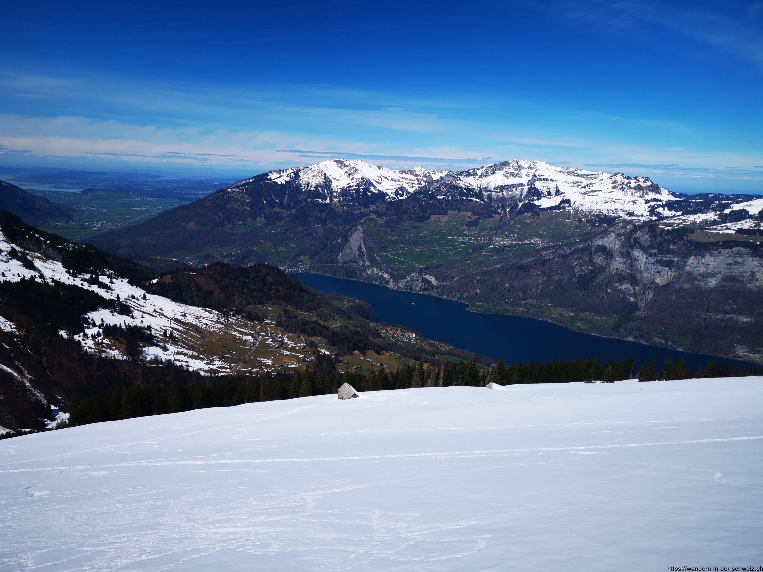 Startpunkt ist Obstalden wo es einen kleinen kostenfreien Wanderparkplatz in der Strasse Oberdorf gibt; alternativ gibt es noch einen weiteren Parkplatz an der Kerenzerbergstrasse am Hotel Restaurant Sternen. Vom Wanderparkplatz bin ich dem gelb markierten Wanderweg gefolgt, der mich bis zu Hüttenberge (1’030 m) gebracht hat. Wenige Meter nach dem Parkplatz gibt es eine Bank mit wunderschöner Aussicht auf den Walensee und die Churfirsten, sodass die erste Fotopause bereits angebrochen war bevor ich mich gross vom Auto wegbewegt hatte. Ein gutes Stück oberhalb, mitten auf der Wiese, steht ein etwas verlassen wirkender Wegweiser: hier rechts Richtung Hüttenberge und Murg halten. Anschliessend der Hüttenbergstrasse immer weiter nach Südwesten folgen. Wo die Teerstrasse aufhört schliesst sich eine Schotterstrasse an und erst an deren Ende bei Ammeli (1’062 m) konnte ich die Schneeschuhe anziehen.
