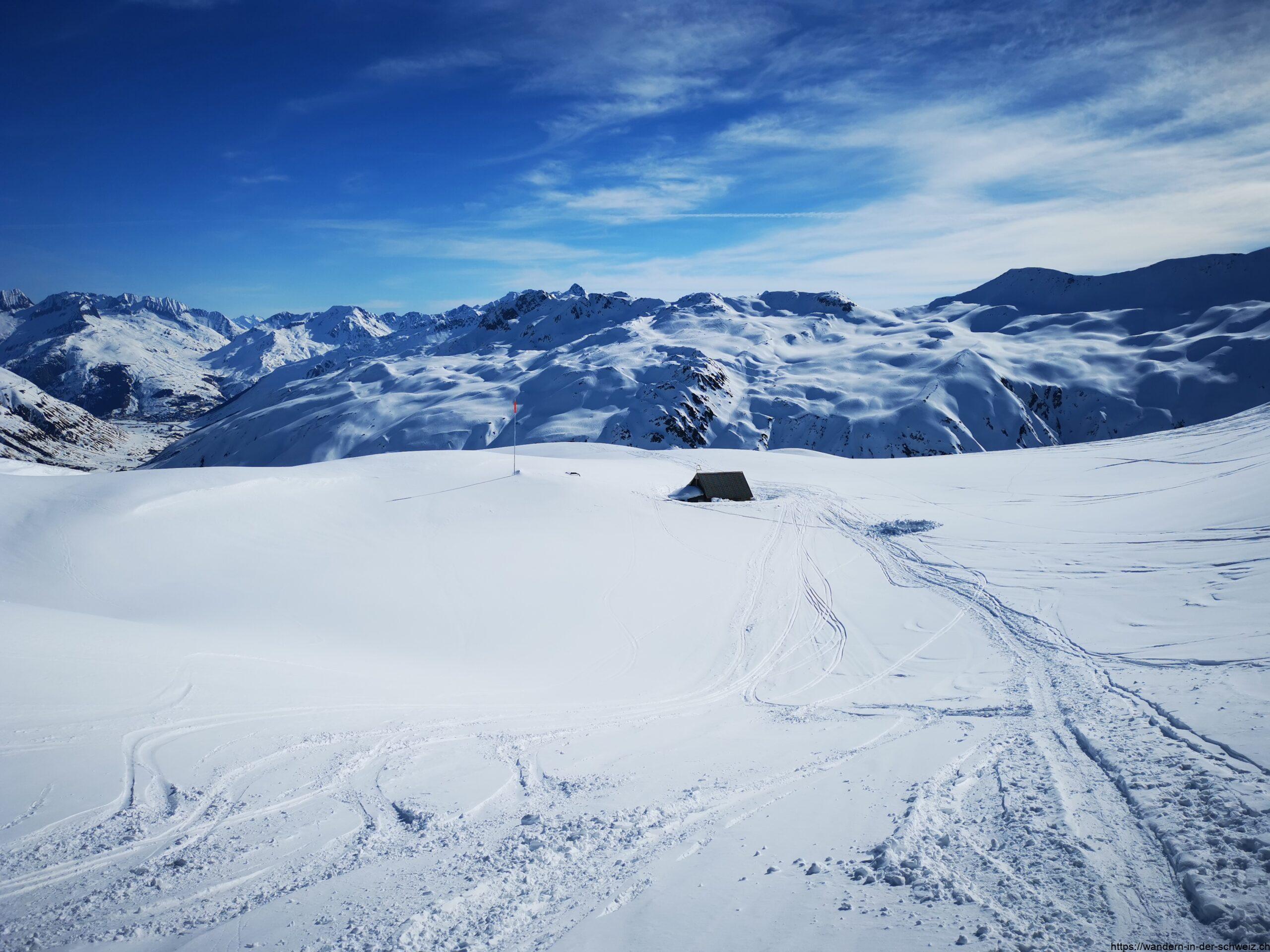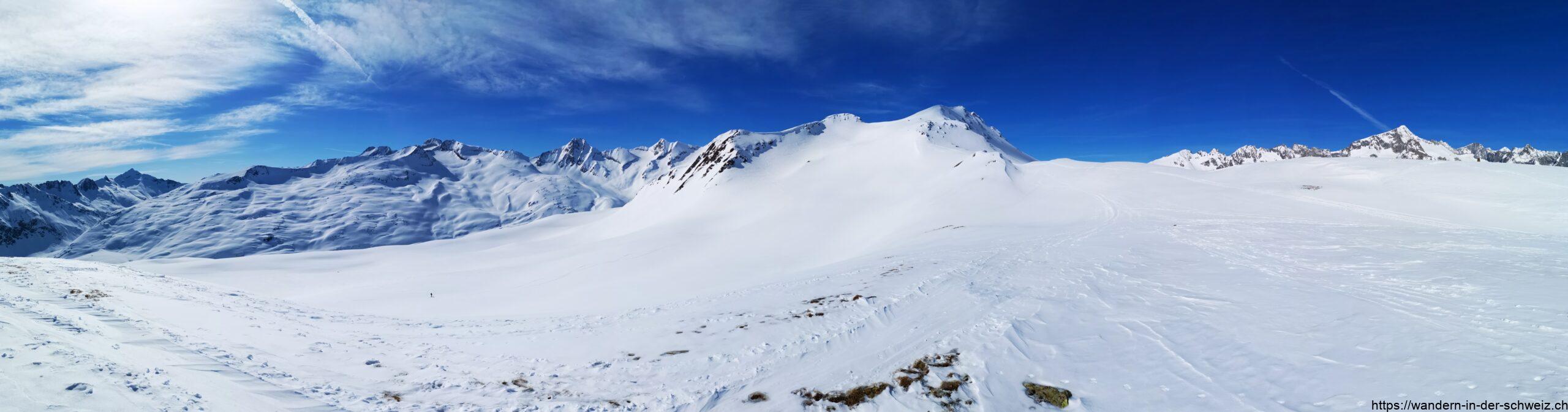 Zurück geht es entweder auf der gleichen Route wie man heraufgekommen ist. Man sieht die ganze Zeit wunderbar ins Witenwasserental, in dem Reap liegt und hält darauf zu. Die Aufstiegsspuren waren wie üblich bereits durch die Skitourenfahrer vollständig zerstört und der Schnee war weich und locker, sodass ich etwas aufpassen musste hinsichtlich Rutschgefahr. Ich selbst hatte mir eine Alternative gesucht, da ich nicht zum Ostgipfel zurückwollte. Also bin ich noch ein Stück weiter dem Kamm entlang gefolgt bis ich nach links abgestiegen bin um in weiten Bögen in der Ebene am Fuss des Firsten entlang zurück nach Realp zu gelangen. Selten scheinen hier Skifahrer abzufahren, sodass ich alleine im Winterparadies unterwegs war. Man kann gut dem Gelände folgen, meist geht es sanft hinab bis man erneut auf die Hütte auf dem Gässler trifft. Von hier nimmt man den bekannten Rückweg – und freut sich auf das Take-Away Angebot des Hotel des Alpes an der Furkastrasse in Realp.