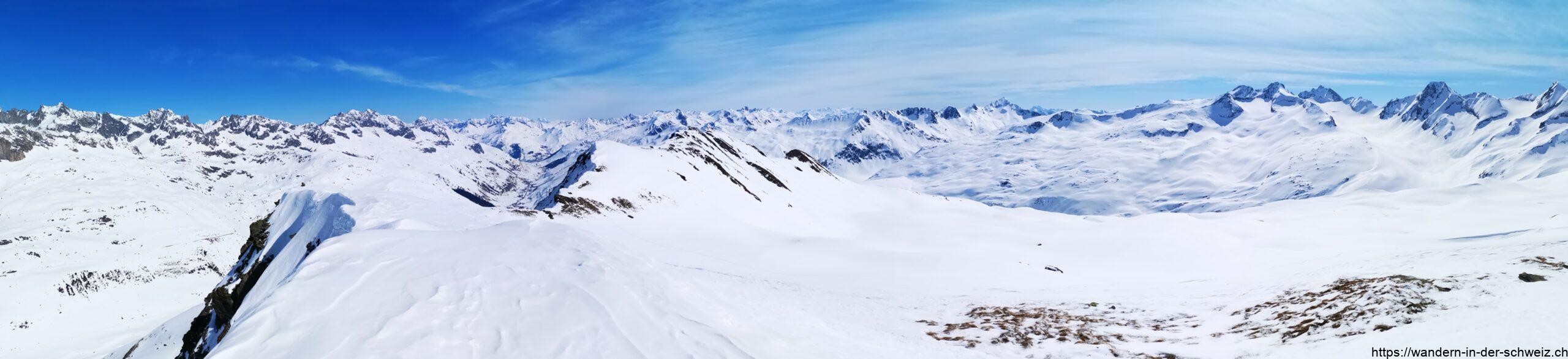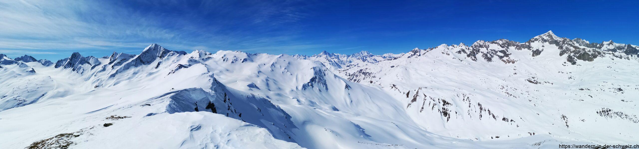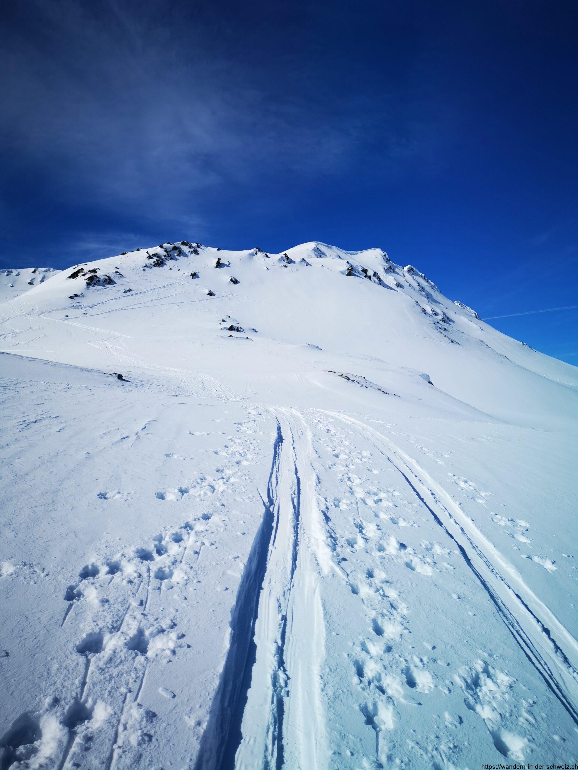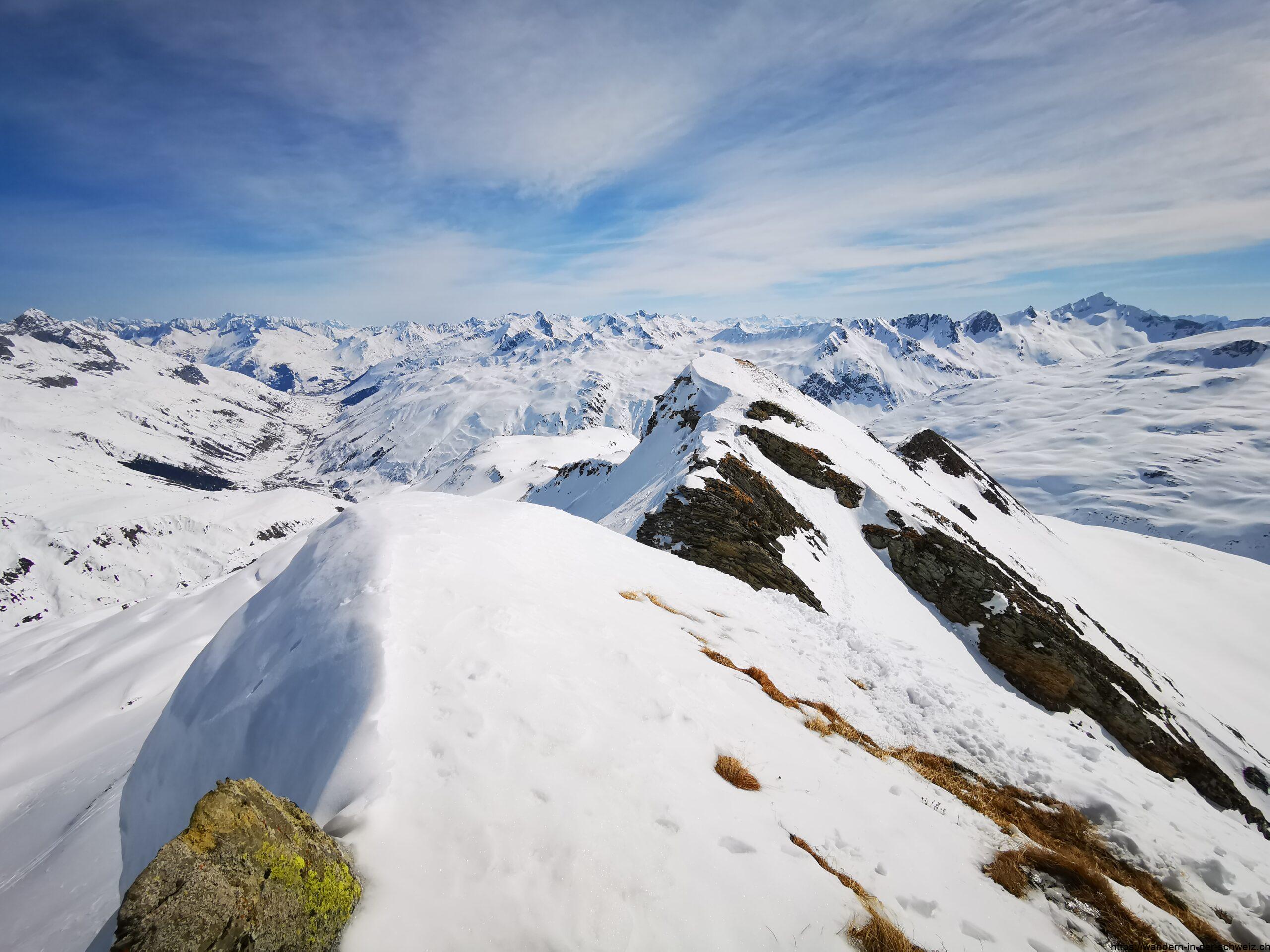 Es gibt nun so viele Spuren und „Wegvorschläge“, dass man gar nicht weiss welcher Route man nun folgen soll. Das Gute an Massentouren ist, dass selbst wenn man absolut keinen Plan hat wo es hingehen soll, die anderen das gleiche Ziel haben: irgendwo wird man vor oder über sich jemanden herumlaufen sehen oder Spuren entdecken, die einem die Richtung anzeigen. Ich habe mir aus der Vielzahl der Möglichkeiten immer den Weg ausgesucht, der mir am stetigsten erschien. Man hält sich konstant Richtung Südwesten, die Beschilderung ist nun nicht mehr gegeben. Ist man an der Privathütte auf dem Gässler auf 2’366 m angekommen, ist man jedoch schonmal auf einem guten Weg. Den Stotzigen Firsten zu erreichen ist ein bisschen Fleissarbeit für den Kopf: immer wenn ich dachte, ich bin oben, taucht hinter der Kuppe eine neuer „Gipfel“ auf, auf den ich dann zustapfen durfte. Und der Weg entlang der Lägenden Firsten zieht sich. Als ich nach gut 3h 20min den Ostgipfel auf 2’747 m erreicht hatte, dachte ich nun sei ich endlich am Ziel – und war völlig irritiert, warum die Karte unbarmherzig der Meinung war, dass ich noch weiter muss 😀 Die Aussicht, die man unterwegs jedoch hat, entschädigt einen für alles. Ich habe es genossen in dieser Bergwelt so weit oben unterwegs zu sein und die Stille aufnehmen zu können. Der Ostgipfel des Stotzigen Firsten ist tatsächlich das Ziel für 99.9% aller anderen Wintersportler. Hier ist einiges los und es wird auf dem Gipfel wirklich eng. Darum bin ich fünf Meter abgestiegen und habe mich auf dem Nebengipfel niedergelassen bevor ich von zwei Tourenskigängerinnen verjagt worden bin. Es gab Platz ohne Ende für drei Personen, aber die zwei waren der Meinung, dass ich mir den besten Platz ausgesucht hatte (bis dato war ich auch allein gewesen) und haben sich mir quasi zum Gruppenkuscheln in Coronazeiten auf den Schoss gesetzt. So erfolgreich vertrieben habe ich den Übergang westwärts über den Grat zum etwas höheren Nordgipfel (2’752 m) noch selbst gespurt und abseits aller anderen mein persönliches Alpenpanorama genossen. Der Blick schweifte dort in aller Ruhe und ungestört über den Muttengletscher, zurück im Osten Richtung Realp, Andermatt und Oberalppass sowie im Westen auf den Furkapass und ins Wallis.