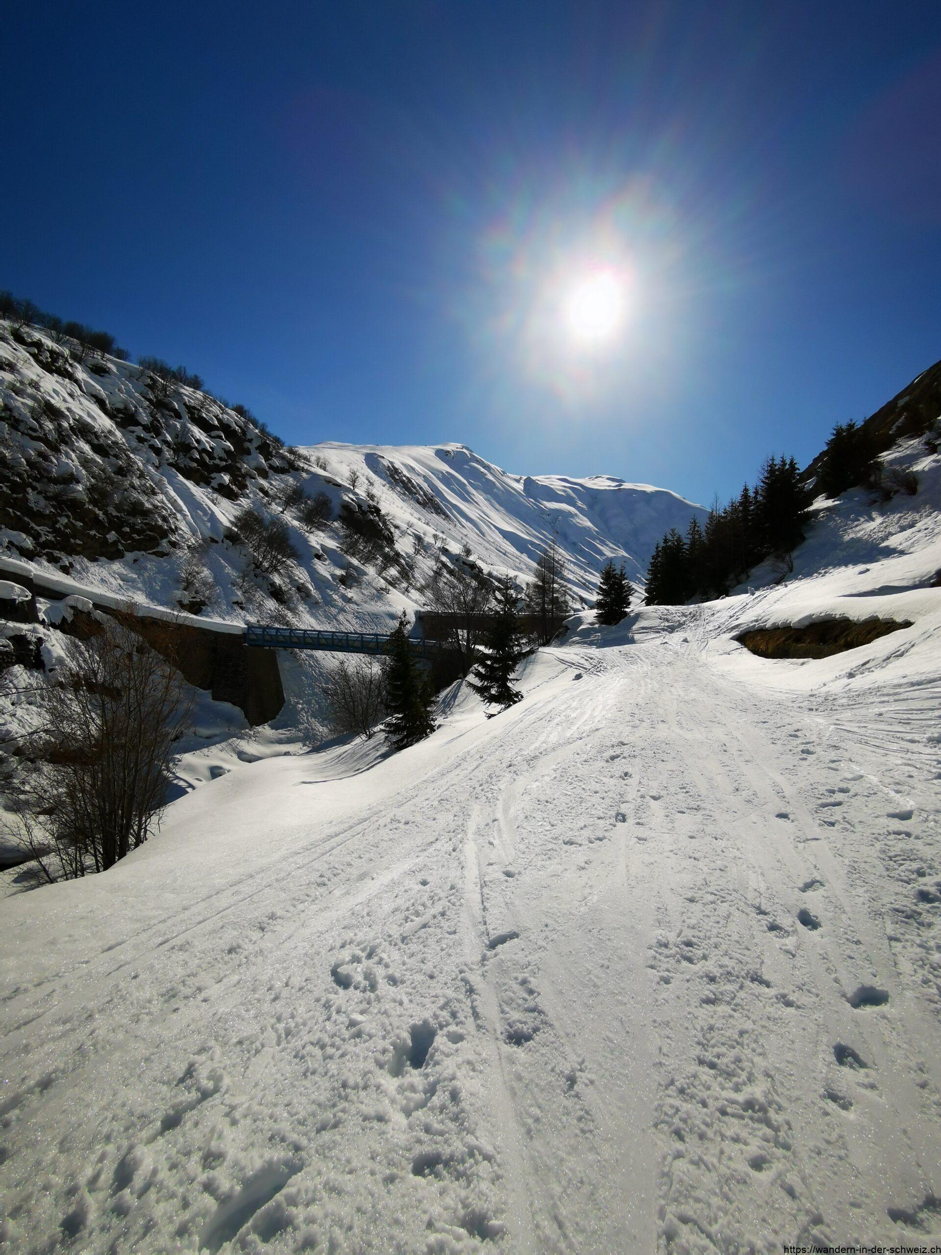Man folgt der Beschilderung Richtung Stotziger Firsten und biegt von der Bahnhofstrasse nach links auf die Furkastrasse. Dieser folgt man nur kurz bevor es entlang der Schweigstrasse parallel zu den Schienen der alten Furkabahnlinie weitergeht. Auf dieser Tour ist die Wahrscheinlichkeit allein unterwegs zu sein ausserordentlich gering, also schnallte ich mir hinter dem Bahnhof Realp DFB die Schneeschuhe mit gefühlt hundert anderen Wanderern beziehungsweise Skitourengängern unter die Füsse und fragte mich ob das wirklich eine lohnenswerte Tour sein würde. Die Antwort lautete ja, aber teilweise dadurch begründet, dass ich es geschafft hatte der Massenwanderung zu entkommen. Bei Geren habe ich die Strasse verlassen und bin dem Sommerwanderweg gefolgt. Nach den Spuren zu schliessen gehen die meisten anderen Leute noch in Stück die Strasse weiter, bevor sie auf den Weg queren. Für mich nicht schlimm; so hatte ich meine Ruhe. Kurze Zeit später habe ich Laubgädem (1’729 m) erreicht und ab hier ist man wieder gemeinsam unterwegs.
