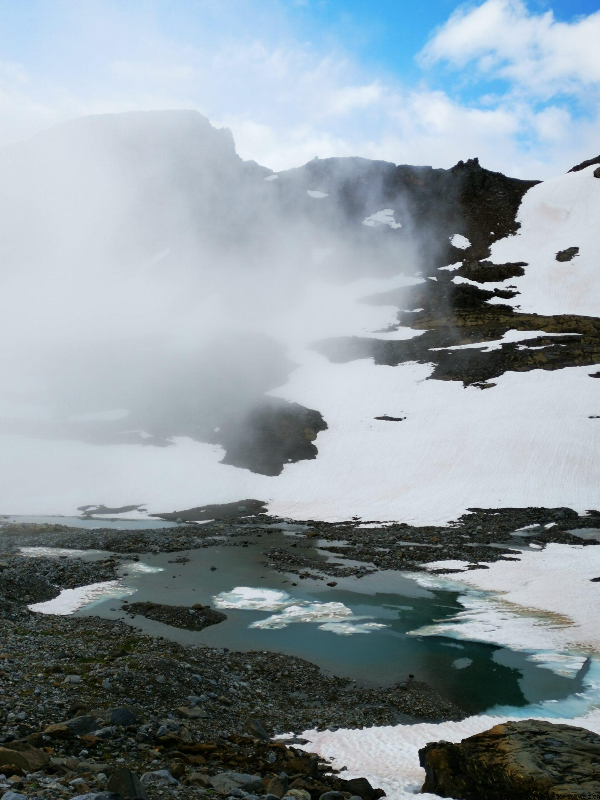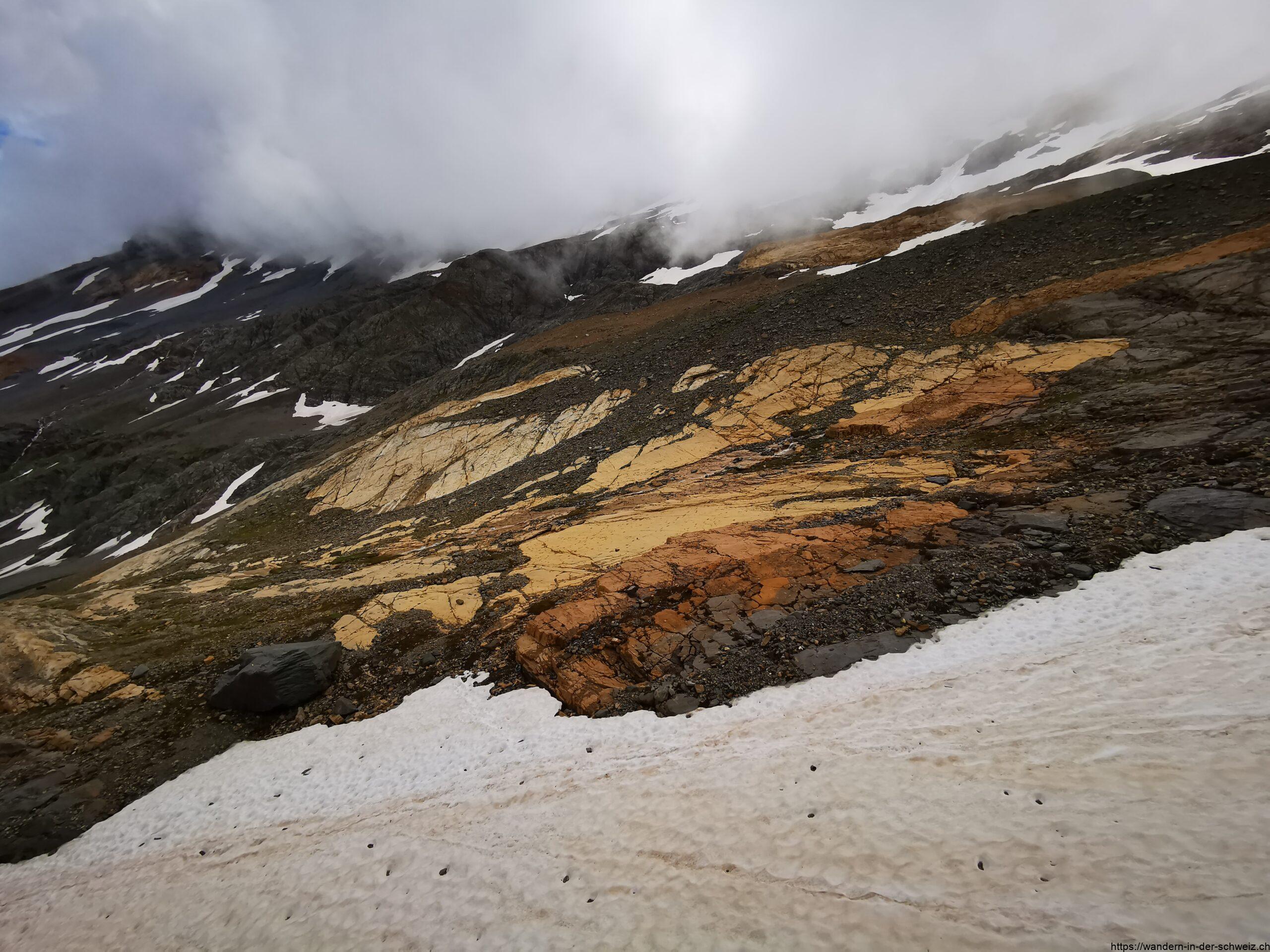 Das Wetter machte an diesem Tag leider keinen allzu guten Eindruck und dabei wird diese Etappe als besonders aussichtsreich beschrieben; mit permanentem Blick auf den Tödi (3’574 m), den König der Berge. Dennoch war sie wunderschön und ich habe eindeutig zu wenig zu erzählen um die ganzen fantastisch-mystischen Fotos passend einzubinden. Los ging es aber erst einmal durch den Schnee im Nebel von der Claridenhütte zur Beggilüggi (2’536 m), dem höchsten Punkt der heutigen Tour. Auf halber Strecke erwartet ein kleiner See den Wanderer, welcher im Hochsommer sicherlich eine erfrischende Abkühlung verspricht. Im Nebel und mit Blick auf das darin schwimmende Eis bin ich jedoch fröstelnd weitergelaufen. Mir ist heute noch schleierhaft, wie manch Gast auf der Claridenhütte am Vortag dort gebadet hat. Auch über die Beggilüggi bin ich dann hinweg, ohne viel Notiz von der Landschaft zu nehmen zu können. Im Anschluss führt der gut markierte rot-weisse Weg sanft über Alpweiden hinab und man hört die Glocken der Kühe schon aus grosser Entfernung. Die vielen Löcher verraten zudem, dass auch Murmeltiere sich hier Zuhause fühlen. Nach knapp 2 h habe ich schliesslich Ober Sand (1’927 m) erreicht; der Wegweiser spricht von 1 h Gehzeit. Von hier aus geht es entweder direkt geradeaus zur Fridolinshütte oder man wagt Richtung Südwesten den Abstecher zur Planurahütte. Unterwegs dorthin kommt man an den Saurierspuren vorbei – und die wollte ich schliesslich unbedingt sehen. Nebel hin oder her.