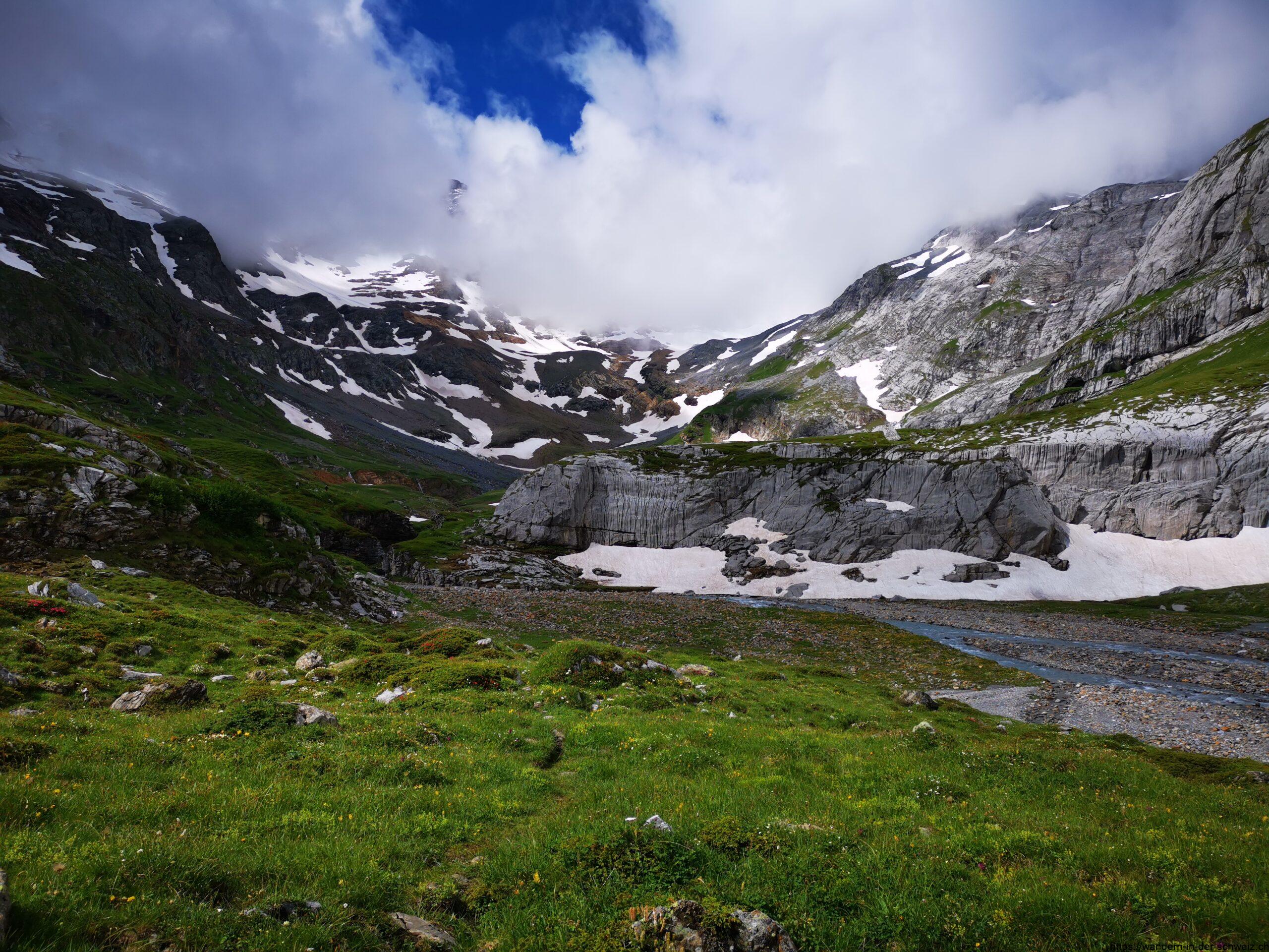 Entlang des Oberstafelbachs folgt man ab Ober Sand dem rot-weissen Wanderweg bis zum Sandpassweidli. Die Alp kann man nicht verfehlen und dahinter präsentiert sich eine malerische Landschaft. Der Aufstieg zur Planurahütte beziehungsweise zu den Saurierspuren verläuft zuerst gemütlich über die Wiese bevor es dann steiler wird. Es dauert nicht lange bis das Gras durch Stein abgelöst wird. Hier an diesem Übergang habe ich endlich Edelweiss am Wegesrand entdeckt – die ersten überhaupt!