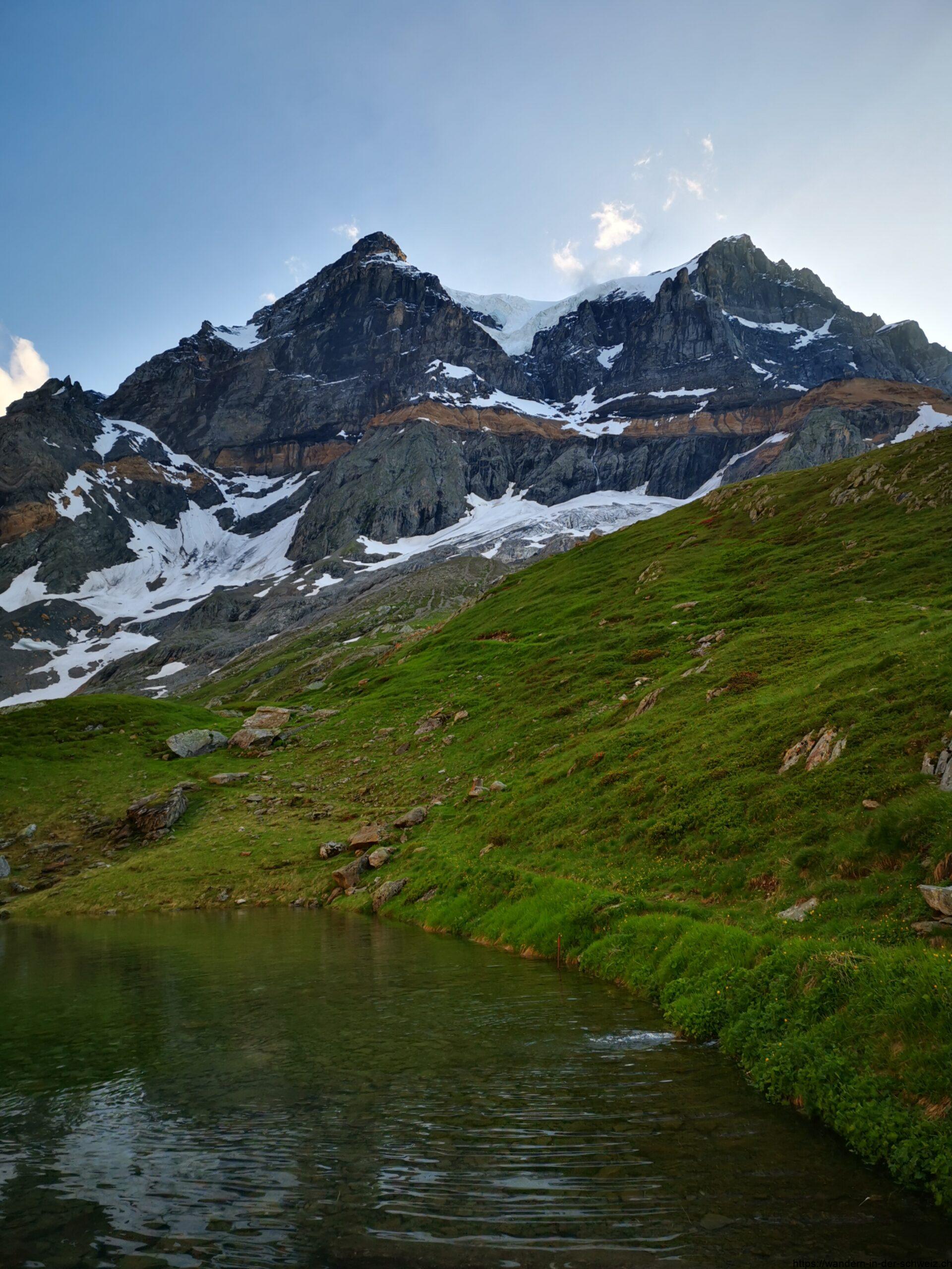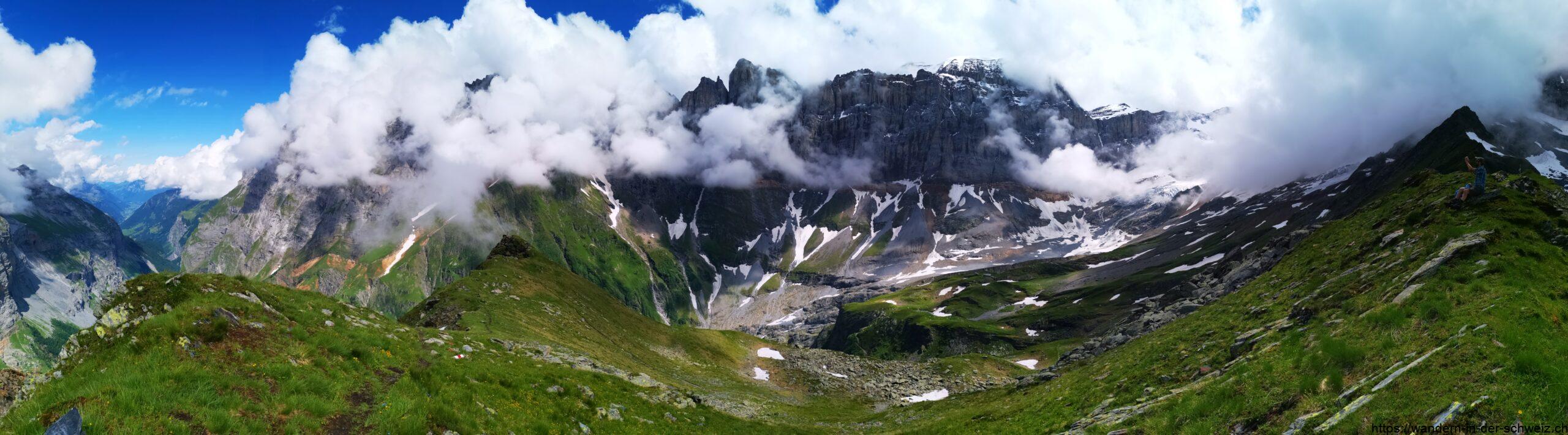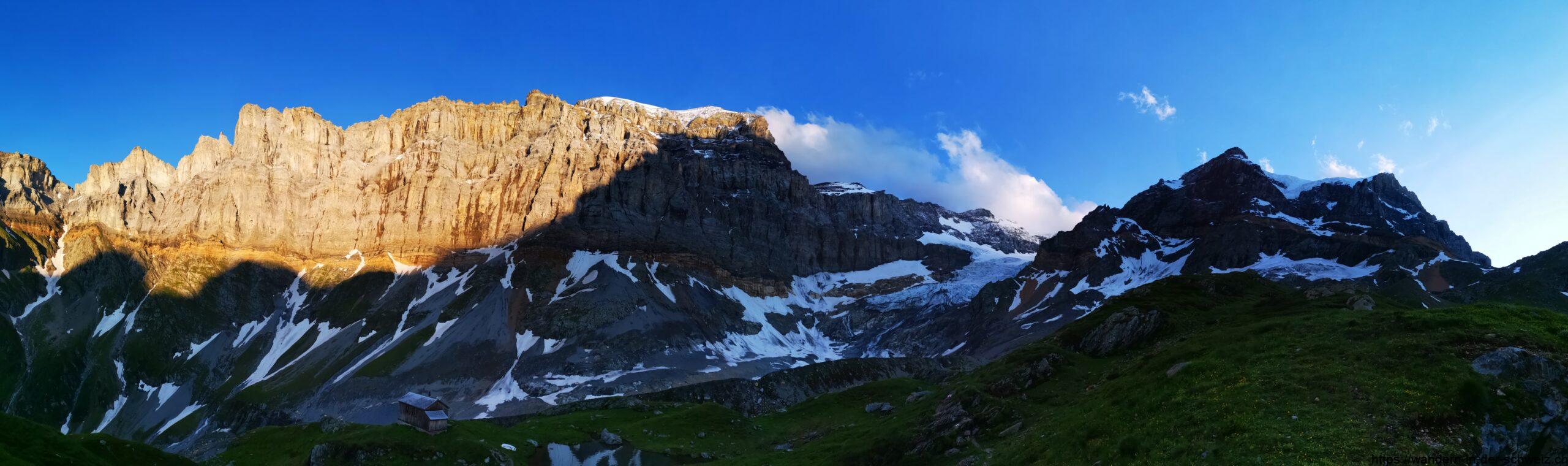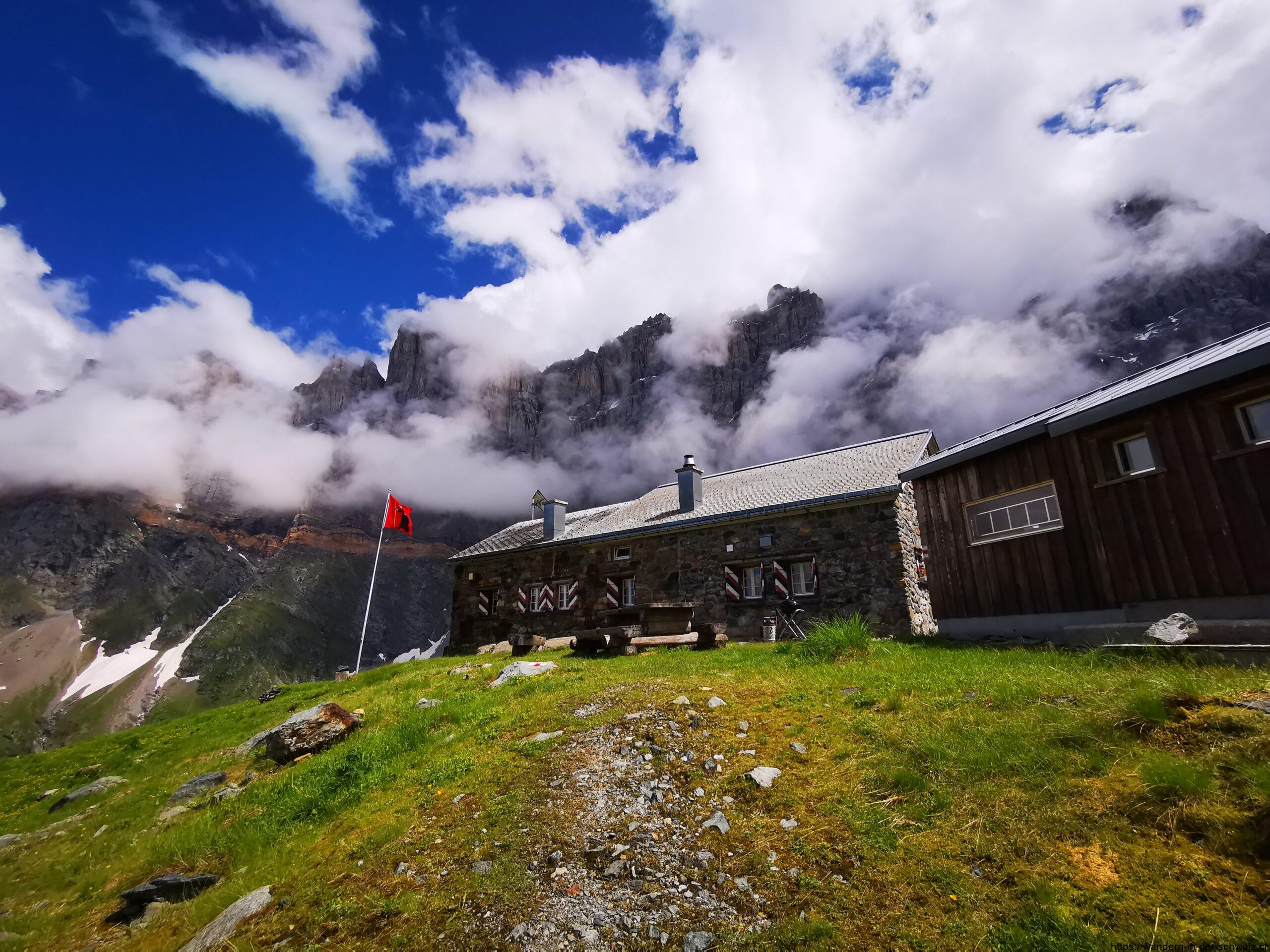So war ich am Fusse des Tödi – Sandgipfel (3’390 m) unterwegs und damit dem dicht in Wolken gehüllten König noch ein kleines bisschen näher. Wieder auf der Originalweg angekommen ging es nun die letzten Höhenmeter hinauf zum Ochsenstock (2’265 m). Von hier aus kann man nochmal ein wunderschönes Panorama auf den Bifertenstock (3’419 m) und die beiden Gipfel des Tödi (Glarner Tödi und Sandgipfel) geniessen bevor es hinab zur Fridolinshütte geht. Diese liegt in einem Talkessel, umschlossen von den zwei genannten mächtigen Bergmassiven. Kein Wunder, dass hier eine ganz eindrückliche Stimmung herrscht. Die Hütte wird zudem auch als Startpunkt für Hochtourengänger genutzt, die von hier aus den Tödi oder den Bifertenstock besteigen möchten. Wobei der Tödi sich unvergleichlich grösserer Beliebtheit erfreut. Das Personal gibt sich zudem Mühe Wanderer und Hochtourengänger zu trennen, damit man nicht unnötig um 3.30 Uhr geweckt wird. Wer möchte kann noch einen kleinen Abstecher zur Grünhornhütte machen. Diese liegt 1 h Gehzeit von der Fridolinshütte entfernt, ist nicht bewirtschaftet und verfügt über keine Schlafplätze. Sie ist aber mit Baujahr 1863 die älteste SAC-Hütte und damit etwas ganz besonderes. Ich habe sie am nächsten Tag besucht. Ansonsten bietet ein kleiner See unterhalb der Hütte eine schöne Gelegenheit sich zu erfrischen.